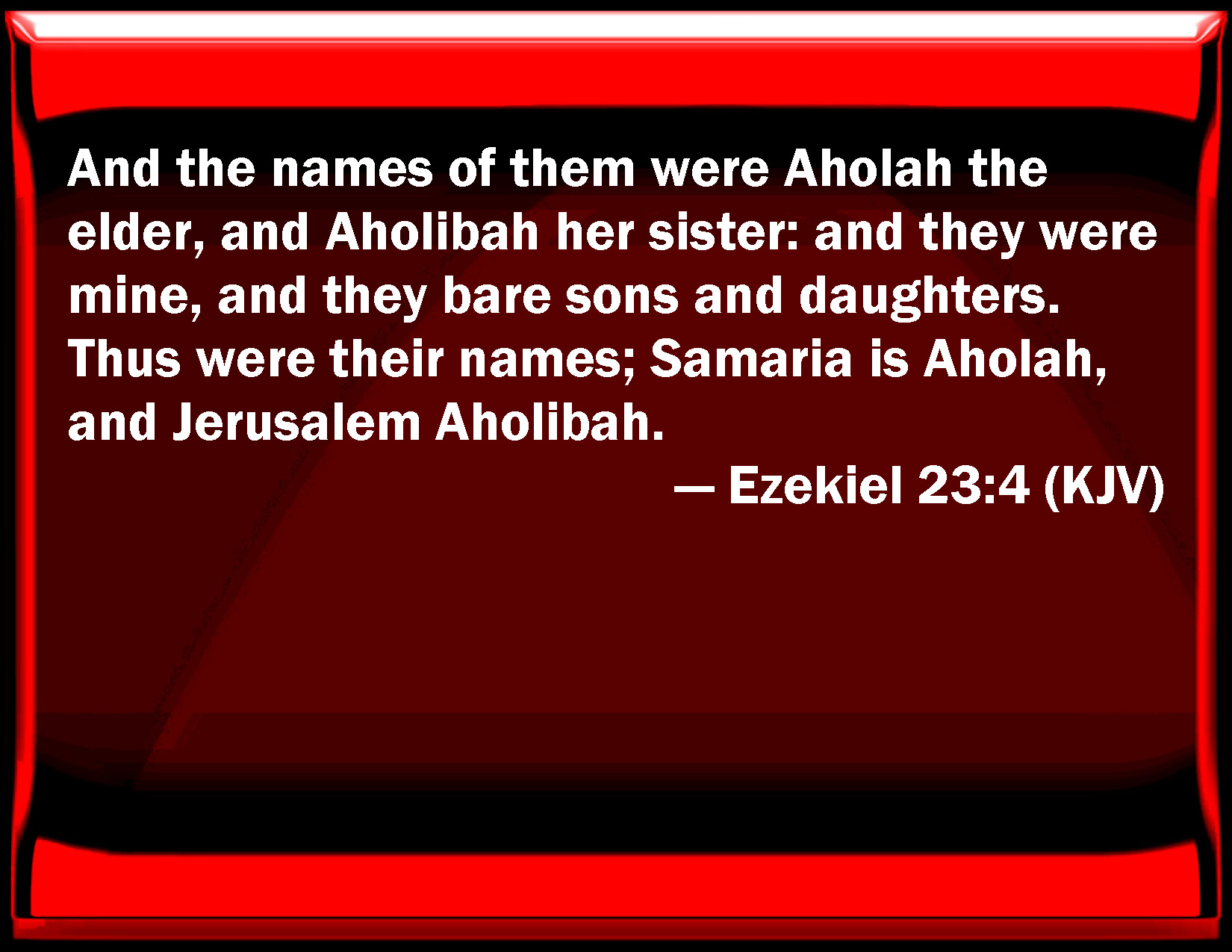 Bible Verse Slide Ezekiel 23:4 And the names of them were Aholah the elder, and Aholibah her sister: and they were mine, and they bore sons and daughters. Thus were their names; Samaria is Aholah, and Jerusalem Aholibah. KJV: And the names of them were Aholah the elder, and Aholibah her sister: and they were mine, and they bare sons and daughters. Thus were their names; Samaria is Aholah, and Jerusalem Aholibah. DRB: And their names were Oolla the elder, and Ooliba her younger sister: and I took them, and they bore sons and daughters. Now for their names, Samaria is Oolla, and Jerusalem is Ooliba. DBT: And their names were Oholah the elder, and Oholibah her sister; and they were mine, and they bore sons and daughters. As for their names: Samaria is Oholah, and Jerusalem Oholibah. ERV: And the names of them were Oholah the elder, and Oholibah her sister: and they became mine, and they bare sons and daughters. And as for their names, Samaria is Oholah, and Jerusalem Oholibah. WBT: And the names of them were Aholah the elder, and Aholibah her sister: and they were mine, and they bore sons and daughters. Thus were their names; Samaria is Aholah, and Jerusalem Aholibah. WEB: The names of them were Oholah the elder, and Oholibah her sister: and they became mine, and they bore sons and daughters. As for their names, Samaria is Oholah, and Jerusalem Oholibah. YLT: And their names are Aholah the elder, And Aholibah her sister, And they are Mine, and bear sons and daughters. As to their names — Samaria is Aholah, And Jerusalem is Aholibah.Links Ezekiel 23:4 NIV • Ezekiel 23:4 NLT • Ezekiel 23:4 ESV • Ezekiel 23:4 NASB • Ezekiel 23:4 KJV • Ezekiel 23:4 Interlinear • Ezekiel 23:4 Commentaries • Ezekiel 23:4 Parallel Texts • Ezekiel 23:4 Bible Apps • Ezekiel 23:4 Parallel • Bible Hub |