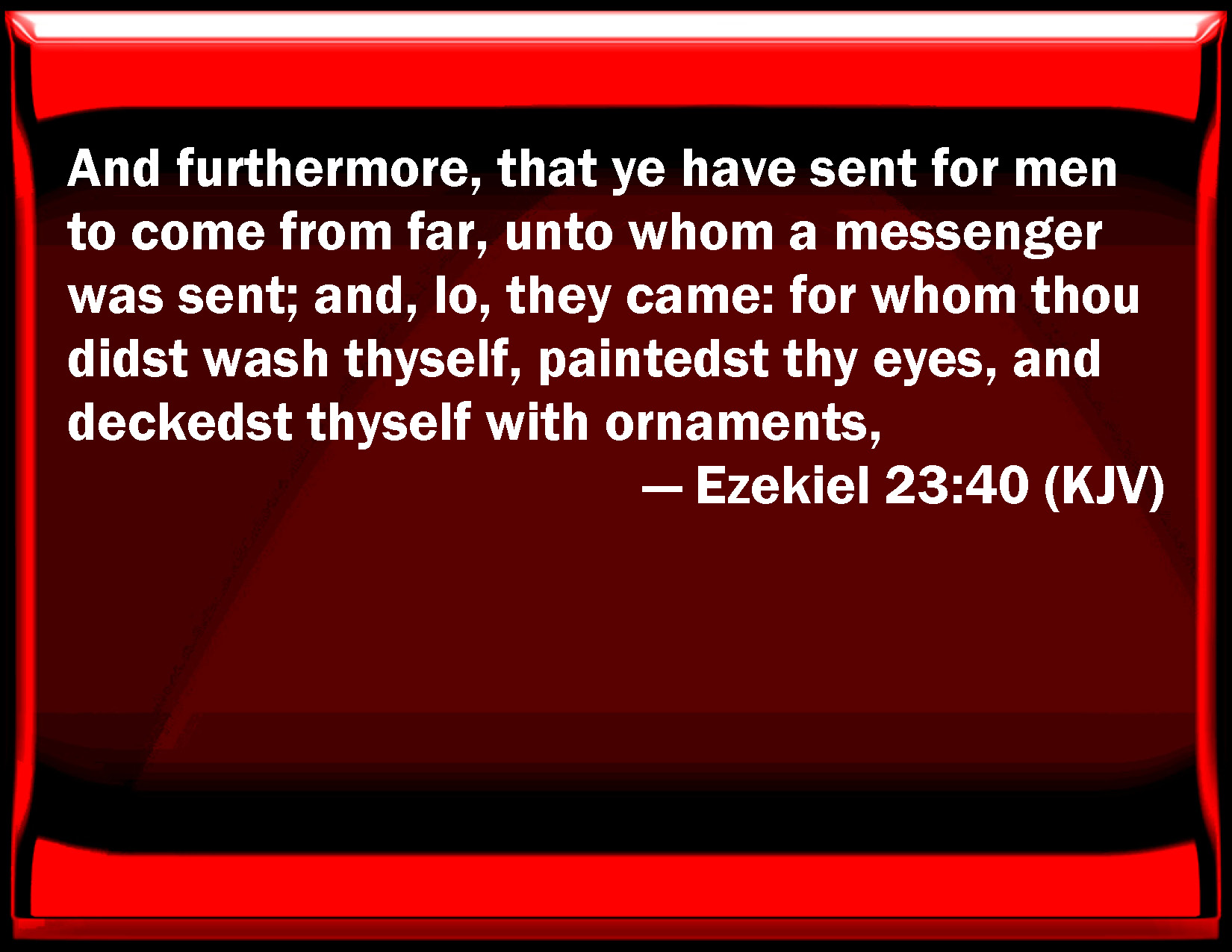 Bible Verse Slide Ezekiel 23:40 And furthermore, that you have sent for men to come from far, to whom a messenger was sent; and, see, they came: for whom you did wash yourself, painted your eyes, and decked yourself with ornaments, KJV: And furthermore, that ye have sent for men to come from far, unto whom a messenger was sent; and, lo, they came: for whom thou didst wash thyself, paintedst thy eyes, and deckedst thyself with ornaments, DRB: They sent for men coming from afar, to whom they had sent a messenger: and behold they came: for whom thou didst wash thyself, and didst paint thy eyes, and wast adorned with women's ornaments. DBT: And furthermore, they sent for men to come from far, unto whom a messenger was sent; and behold, they came: for whom thou didst wash thyself, paintedst thine eyes, and deckedst thyself with ornaments; ERV: And furthermore ye have sent for men that come from far: unto whom a messenger was sent, and, lo, they came; for whom thou didst wash thyself, paintedst thine eyes, and deckedst thyself with ornaments; WBT: And furthermore, that ye have sent for men to come from far, to whom a messenger was sent; and lo, they came: for whom thou didst wash thyself, paint thy eyes, and deck thyself with ornaments, WEB: Furthermore you have sent for men who come from far, to whom a messenger was sent, and behold, they came; for whom you did wash yourself, paint your eyes, and decorate yourself with ornaments, YLT: And also that they send to men coming from afar, Unto whom a messenger is sent, And lo, they have come in for whom thou hast washed, Painted thine eyes, and put on adornment.Links Ezekiel 23:40 NIV • Ezekiel 23:40 NLT • Ezekiel 23:40 ESV • Ezekiel 23:40 NASB • Ezekiel 23:40 KJV • Ezekiel 23:40 Interlinear • Ezekiel 23:40 Commentaries • Ezekiel 23:40 Parallel Texts • Ezekiel 23:40 Bible Apps • Ezekiel 23:40 Parallel • Bible Hub |