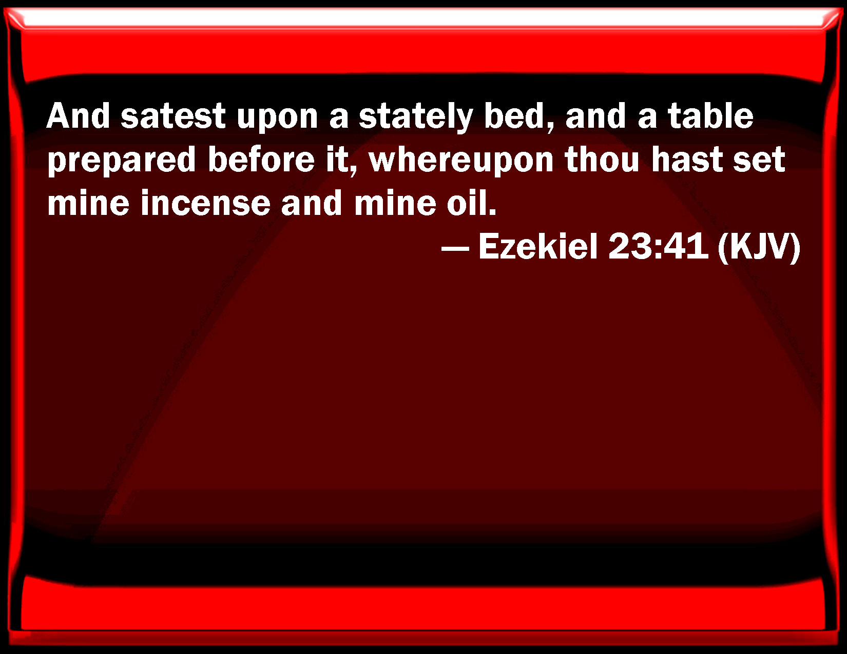 Bible Verse Slide Ezekiel 23:41 And sat on a stately bed, and a table prepared before it, whereupon you have set my incense and my oil. KJV: And satest upon a stately bed, and a table prepared before it, whereupon thou hast set mine incense and mine oil. DRB: Thou sattest on a very fine bed, and a table was decked before thee: whereupon thou didst set my incense, and my ointment. DBT: and satest upon a stately bed, with a table prepared before it, whereupon thou hadst set mine incense and mine oil. ERV: and satest upon a stately bed. with a table prepared before it, whereupon thou didst set mine incense and mine oil. WBT: And sattest upon a stately bed and a table prepared before it, upon which thou hast set my incense and my oil. WEB: and sit on a stately bed, with a table prepared before it, whereupon you set my incense and my oil. YLT: And thou hast sat on a couch of honour, And a table arrayed before it, And My perfume and My oil placed on it.Links Ezekiel 23:41 NIV • Ezekiel 23:41 NLT • Ezekiel 23:41 ESV • Ezekiel 23:41 NASB • Ezekiel 23:41 KJV • Ezekiel 23:41 Interlinear • Ezekiel 23:41 Commentaries • Ezekiel 23:41 Parallel Texts • Ezekiel 23:41 Bible Apps • Ezekiel 23:41 Parallel • Bible Hub |