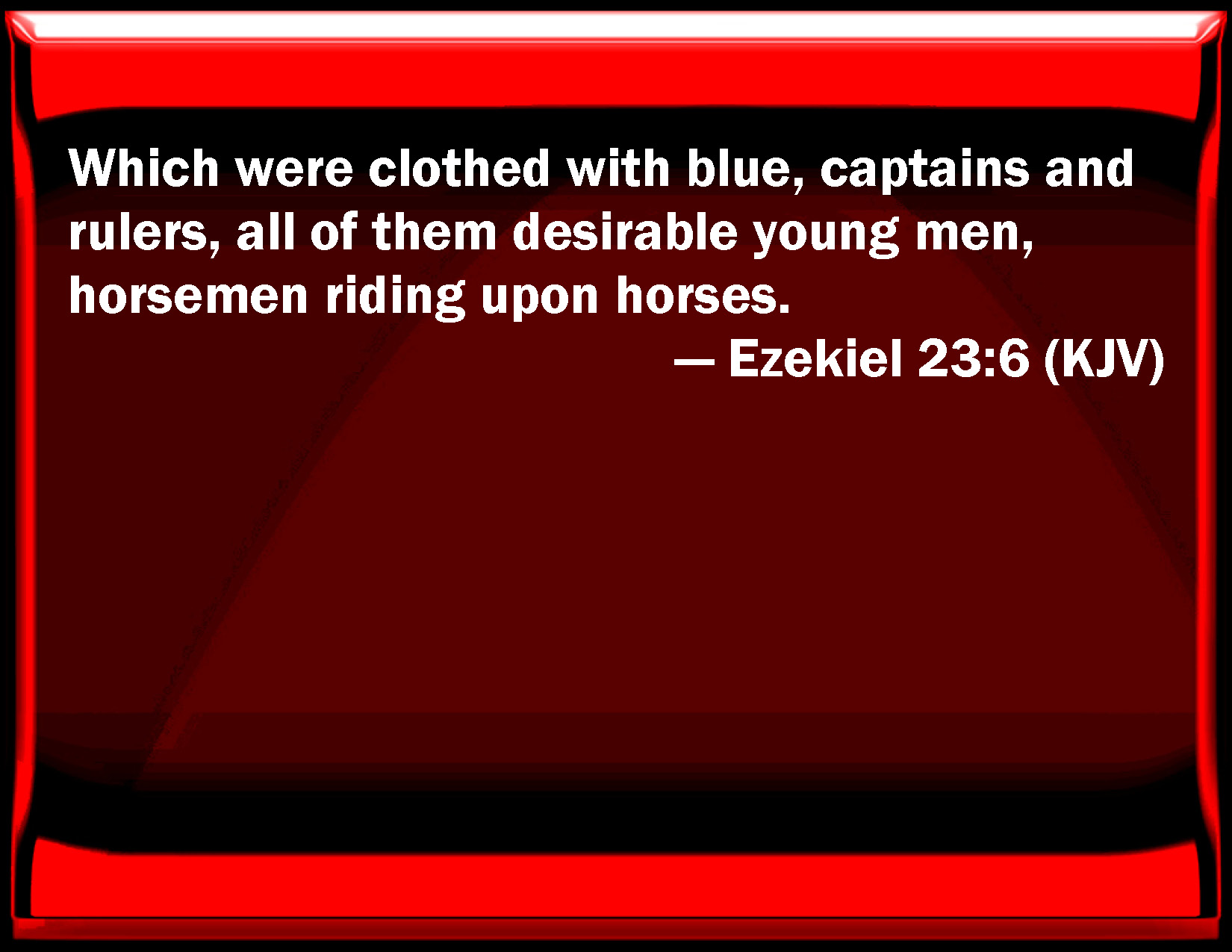 Bible Verse Slide Ezekiel 23:6 Which were clothed with blue, captains and rulers, all of them desirable young men, horsemen riding on horses. KJV: Which were clothed with blue, captains and rulers, all of them desirable young men, horsemen riding upon horses. DRB: Who were clothed with blue, princes, and rulers, beautiful youths, all horsemen, mounted upon horses. DBT: clothed with blue, governors and rulers, all of them attractive young men, horsemen riding upon horses. ERV: which were clothed with blue, governors and rulers, all of them desirable young men, horsemen riding upon horses. WBT: Who were clothed with blue, captains and rulers, all of them desirable young men, horsemen riding upon horses. WEB: who were clothed with blue, governors and rulers, all of them desirable young men, horsemen riding on horses. YLT: Clothed with blue — governors and prefects, Desirable young men all of them, Horsemen, riding on horses,Links Ezekiel 23:6 NIV • Ezekiel 23:6 NLT • Ezekiel 23:6 ESV • Ezekiel 23:6 NASB • Ezekiel 23:6 KJV • Ezekiel 23:6 Interlinear • Ezekiel 23:6 Commentaries • Ezekiel 23:6 Parallel Texts • Ezekiel 23:6 Bible Apps • Ezekiel 23:6 Parallel • Bible Hub |