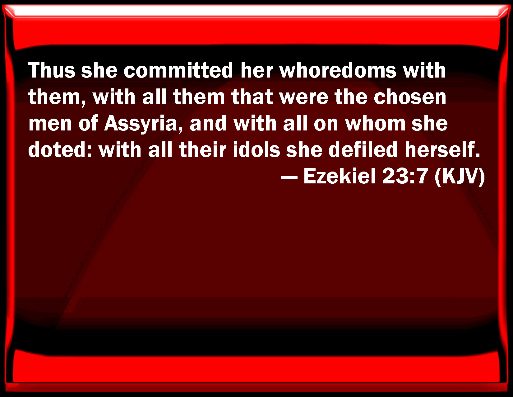 Bible Verse Slide Ezekiel 23:7 Thus she committed her prostitutions with them, with all them that were the chosen men of Assyria, and with all on whom she doted: with all their idols she defiled herself. KJV: Thus she committed her whoredoms with them, with all them that were the chosen men of Assyria, and with all on whom she doted: with all their idols she defiled herself. DRB: And she committed her fornications with those chosen men, all sons of the Assyrians: and she defiled herself with the uncleanness of all them on whom she doted. DBT: And she bestowed her whoredoms upon them, all of them the choice of the children of Asshur; and with all after whom she lusted, with all their idols she defiled herself. ERV: And she bestowed her whoredoms upon them, the choicest men of Assyria all of them: and on whomsoever she doted, with all their idols she defiled herself. WBT: Thus she committed her lewd deeds with them, with all them that were the chosen men of Assyria, and with all on whom she doted: with all their idols she defiled herself. WEB: She bestowed her prostitution on them, the choicest men of Assyria all of them; and on whoever she doted, with all their idols she defiled herself. YLT: And she giveth her whoredoms on them, The choice of the sons of Asshur, All of them — even all on whom she doted, By all their idols she hath been defiled.Links Ezekiel 23:7 NIV • Ezekiel 23:7 NLT • Ezekiel 23:7 ESV • Ezekiel 23:7 NASB • Ezekiel 23:7 KJV • Ezekiel 23:7 Interlinear • Ezekiel 23:7 Commentaries • Ezekiel 23:7 Parallel Texts • Ezekiel 23:7 Bible Apps • Ezekiel 23:7 Parallel • Bible Hub |