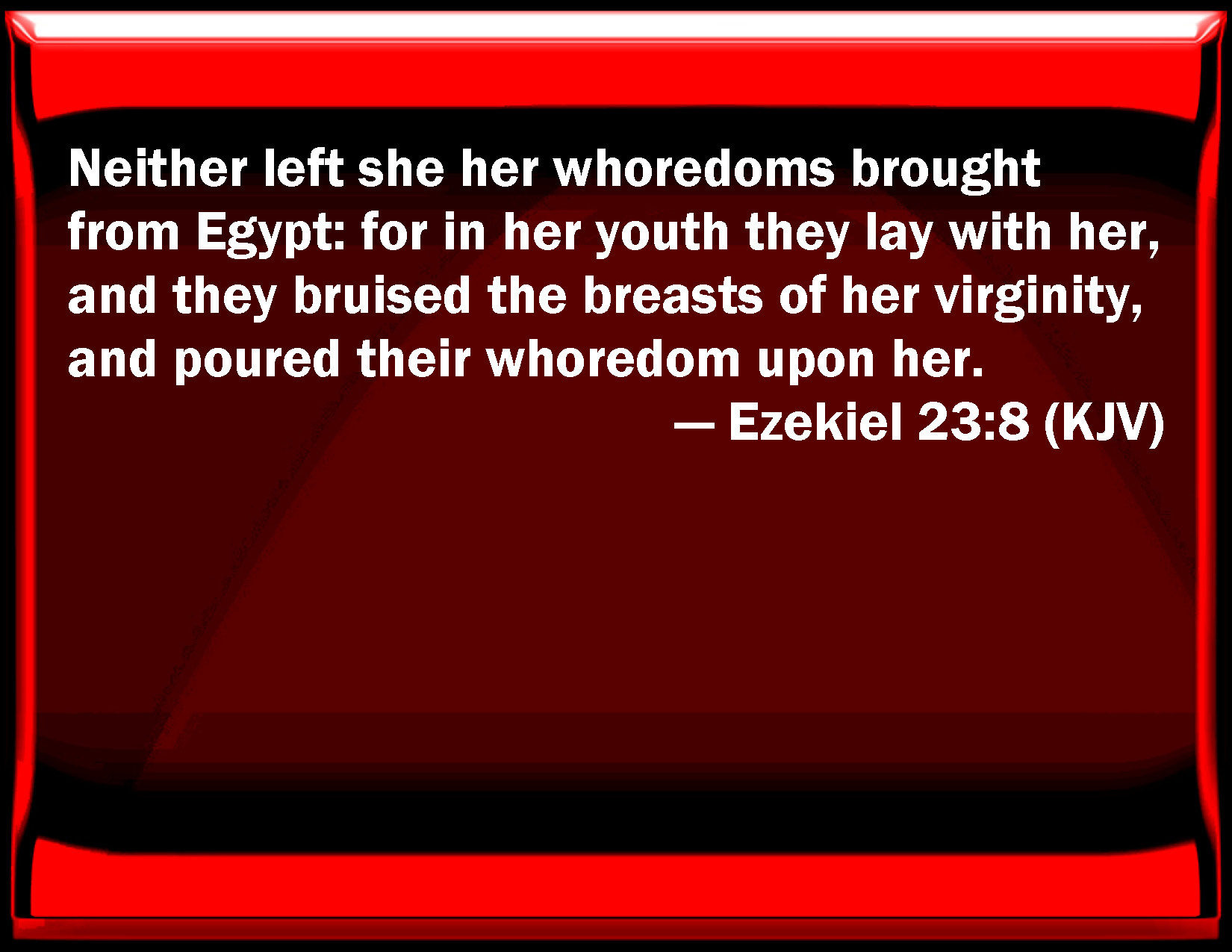 Bible Verse Slide Ezekiel 23:8 Neither left she her prostitutions brought from Egypt: for in her youth they lay with her, and they bruised the breasts of her virginity, and poured their prostitution on her. KJV: Neither left she her whoredoms brought from Egypt: for in her youth they lay with her, and they bruised the breasts of her virginity, and poured their whoredom upon her. DRB: Moreover also she did not forsake her fornications which she had committed in Egypt: for they also lay with her in her youth, and they bruised the breasts of her virginity, and poured out their fornication upon her. DBT: Neither left she her whoredoms brought from Egypt; for in her youth they had lain with her, and had handled the breasts of her virginity, and poured their fornication upon her. ERV: Neither hath, she left her whoredoms since the days of Egypt; for in her youth they lay with her, and they bruised the teats of her virginity: and they poured out their whoredom upon her. WBT: Neither left she her lewd deeds brought from Egypt: for in her youth they lay with her, and they first corrupted her, and poured their impurities upon her. WEB: Neither has she left her prostitution since [the days of] Egypt; for in her youth they lay with her, and they handled the bosom of her virginity; and they poured out their prostitution on her. YLT: And her whoredoms out of Egypt she hath not forsaken, For with her they lay in her youth, And they dealt with the loves of her virginity, And they pour out their whoredoms on her.Links Ezekiel 23:8 NIV • Ezekiel 23:8 NLT • Ezekiel 23:8 ESV • Ezekiel 23:8 NASB • Ezekiel 23:8 KJV • Ezekiel 23:8 Interlinear • Ezekiel 23:8 Commentaries • Ezekiel 23:8 Parallel Texts • Ezekiel 23:8 Bible Apps • Ezekiel 23:8 Parallel • Bible Hub |