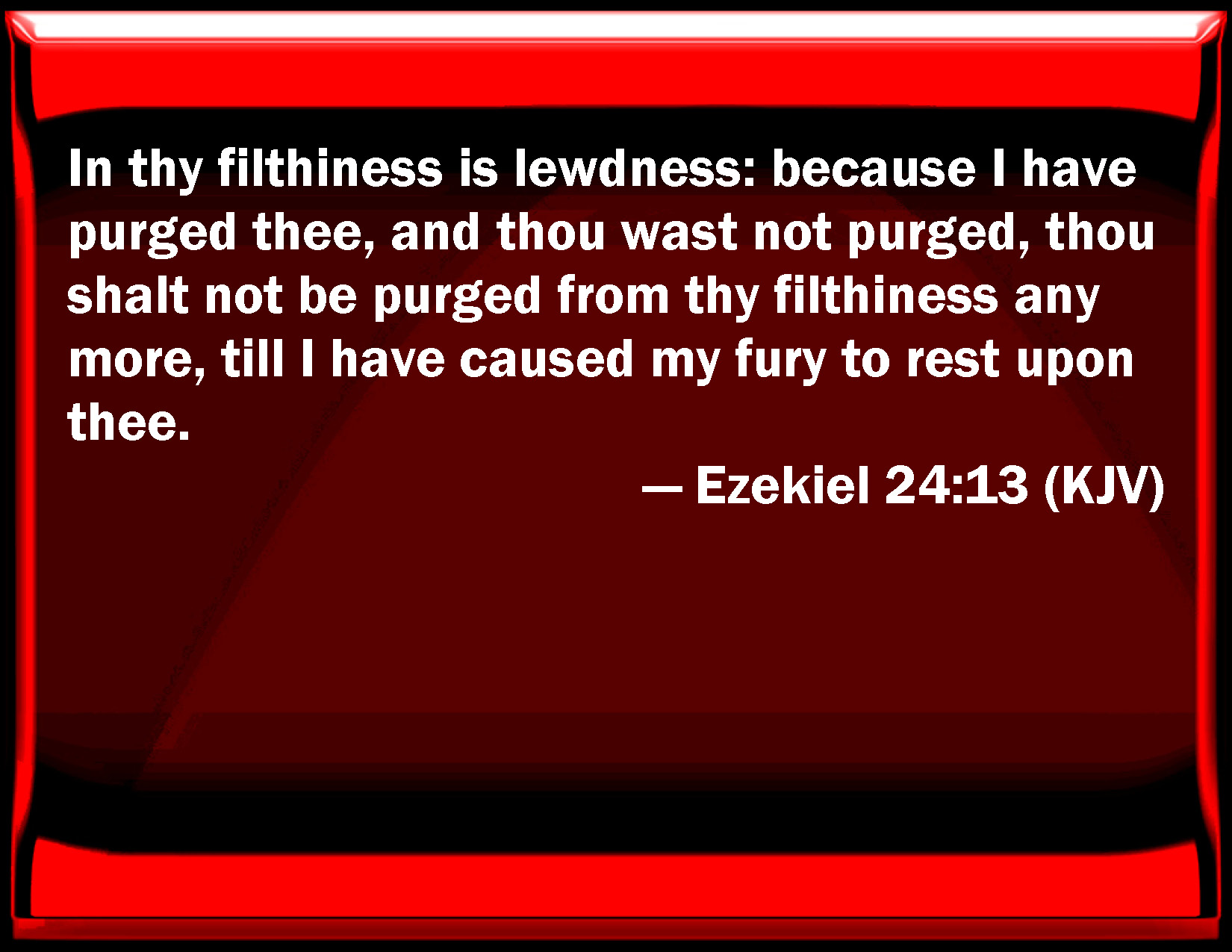 Bible Verse Slide Ezekiel 24:13 In your filthiness is lewdness: because I have purged you, and you were not purged, you shall not be purged from your filthiness any more, till I have caused my fury to rest on you. KJV: In thy filthiness is lewdness: because I have purged thee, and thou wast not purged, thou shalt not be purged from thy filthiness any more, till I have caused my fury to rest upon thee. DRB: Thy uncleanness is execrable: be- cause I desired to cleanse thee, and thou art not cleansed from thy filthiness: neither shalt thou be cleansed, before I cause my indignation to rest in thee. DBT: In thy filthiness is lewdness, for I have purged thee, and thou art not pure. Thou shalt no more be purged from thy filthiness, till I have satisfied my fury upon thee. ERV: In thy filthiness is lewdness: because I have purged thee and thou wast not purged, thou shalt not be purged from thy filthiness any more, till I have satisfied my fury upon thee. WBT: In thy filthiness is lewdness: because I have purged thee, and thou wast not purged, thou shalt not be purged from thy filthiness any more, till I have caused my fury to rest upon thee. WEB: In your filthiness is lewdness: because I have cleansed you and you weren't cleansed, you shall not be cleansed from your filthiness any more, until I have caused my wrath toward you to rest. YLT: In thine uncleanness is wickedness, Because I have cleansed thee, And thou hast not been cleansed, From thine uncleanness thou art not cleansed again, Till I have caused My fury to rest on thee.Links Ezekiel 24:13 NIV • Ezekiel 24:13 NLT • Ezekiel 24:13 ESV • Ezekiel 24:13 NASB • Ezekiel 24:13 KJV • Ezekiel 24:13 Interlinear • Ezekiel 24:13 Commentaries • Ezekiel 24:13 Parallel Texts • Ezekiel 24:13 Bible Apps • Ezekiel 24:13 Parallel • Bible Hub |