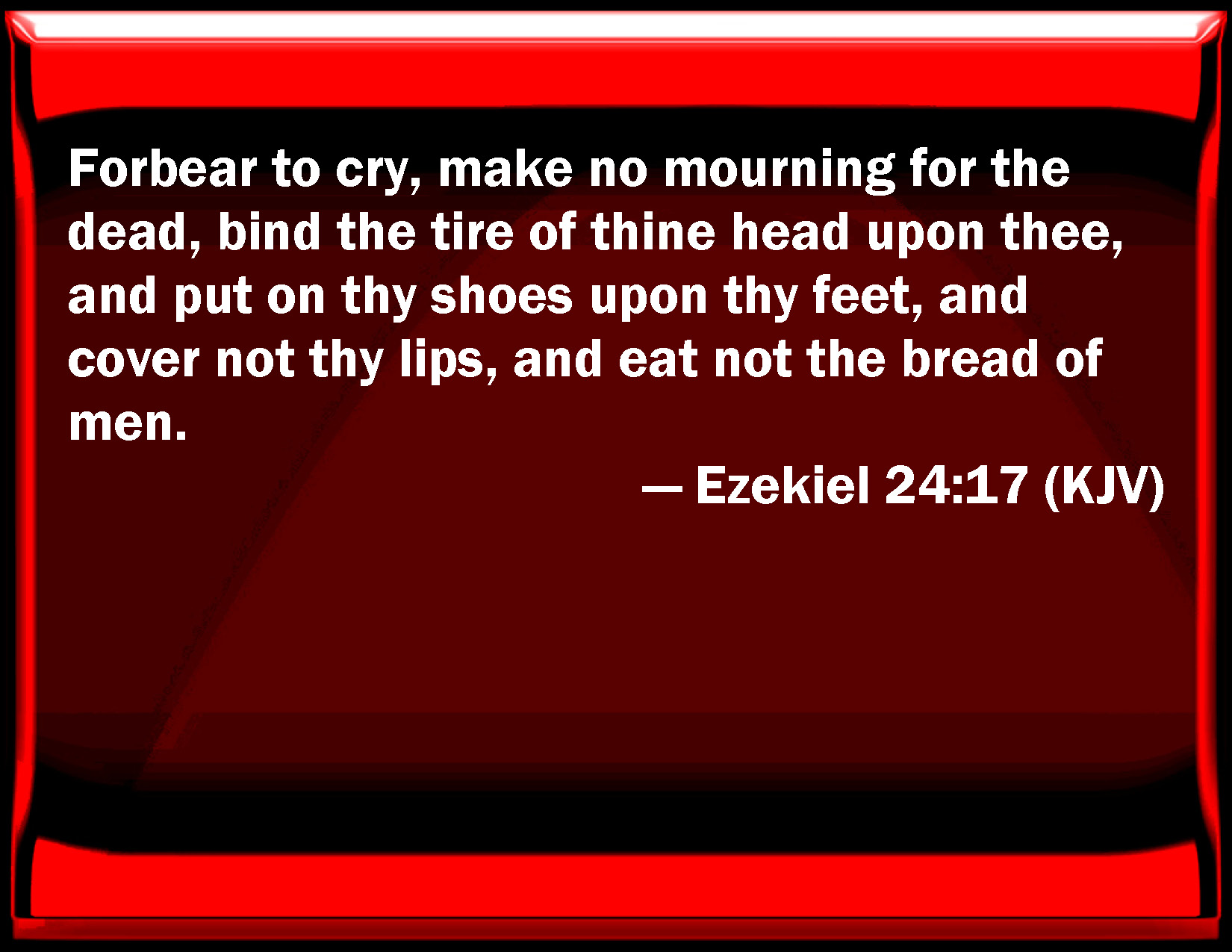 Bible Verse Slide Ezekiel 24:17 Forbear to cry, make no mourning for the dead, bind the tire of your head on you, and put on your shoes on your feet, and cover not your lips, and eat not the bread of men. KJV: Forbear to cry, make no mourning for the dead, bind the tire of thine head upon thee, and put on thy shoes upon thy feet, and cover not thy lips, and eat not the bread of men. DRB: Sigh in silence, make no mourning for the dead: let the tire of thy head be upon thee, and thy shoes on thy feet, and cover not thy face, nor eat the meat of mourners. DBT: Sigh in silence, make no mourning for the dead; bind thy turban upon thee, and put thy sandals upon thy feet, and cover not the beard, and eat not the bread of men. ERV: Sigh, but not aloud; make no mourning for the dead, bind thy headtire upon thee, and put thy shoes upon thy feet, and cover not thy lips, and eat not the bread of men. WBT: Forbear to cry, make no mourning for the dead, bind the tire of thy head upon thee, and put on thy shoes upon thy feet, and cover not thy lips, and eat not the bread of men. WEB: Sigh, but not aloud, make no mourning for the dead; bind your headdress on you, and put your shoes on your feet, and don't cover your lips, and don't eat men's bread. YLT: Cease to groan, for the dead thou dost make no mourning, thy bonnet bind on thee, and thy shoes thou dost put on thy feet, and thou dost not cover over the upper lip, and bread of men thou dost not eat.'Links Ezekiel 24:17 NIV • Ezekiel 24:17 NLT • Ezekiel 24:17 ESV • Ezekiel 24:17 NASB • Ezekiel 24:17 KJV • Ezekiel 24:17 Interlinear • Ezekiel 24:17 Commentaries • Ezekiel 24:17 Parallel Texts • Ezekiel 24:17 Bible Apps • Ezekiel 24:17 Parallel • Bible Hub |