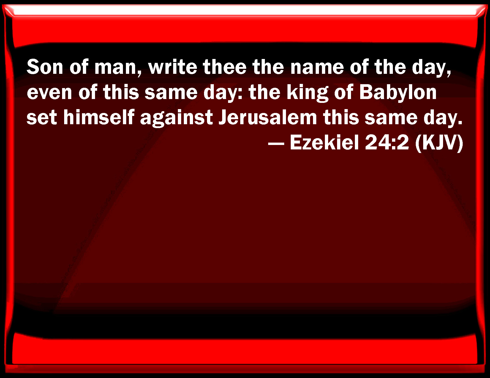 Bible Verse Slide Ezekiel 24:2 Son of man, write you the name of the day, even of this same day: the king of Babylon set himself against Jerusalem this same day. KJV: Son of man, write thee the name of the day, even of this same day: the king of Babylon set himself against Jerusalem this same day. DRB: Son of man, write thee the name of this day, on which the king of Babylon hath set himself against Jerusalem to day. DBT: Son of man, write thee the name of the day, of this selfsame day: on this selfsame day the king of Babylon draws near to Jerusalem. ERV: Son of man, write thee the name of the day, even of this selfsame day: the king of Babylon drew close unto Jerusalem this selfsame day. WBT: Son of man, Write for thee the name of the day, even of this same day: the king of Babylon set himself against Jerusalem this same day. WEB: Son of man, write the name of the day, [even] of this same day: the king of Babylon drew close to Jerusalem this same day. YLT: Son of man, write for thee the name of the day — this self-same day leaned hath the king of Babylon toward Jerusalem in this self-same day — Links Ezekiel 24:2 NIV • Ezekiel 24:2 NLT • Ezekiel 24:2 ESV • Ezekiel 24:2 NASB • Ezekiel 24:2 KJV • Ezekiel 24:2 Interlinear • Ezekiel 24:2 Commentaries • Ezekiel 24:2 Parallel Texts • Ezekiel 24:2 Bible Apps • Ezekiel 24:2 Parallel • Bible Hub |
