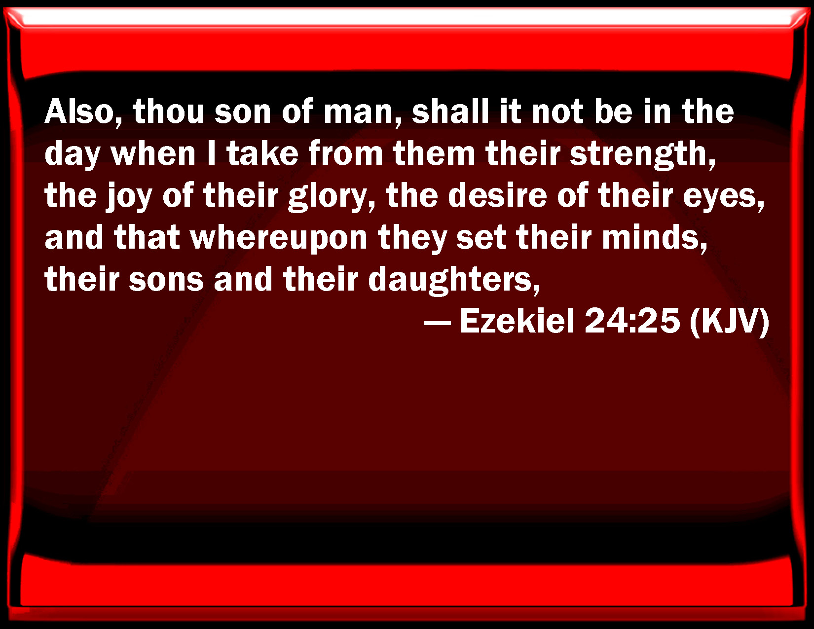 Bible Verse Slide Ezekiel 24:25 Also, you son of man, shall it not be in the day when I take from them their strength, the joy of their glory, the desire of their eyes, and that whereupon they set their minds, their sons and their daughters, KJV: Also, thou son of man, shall it not be in the day when I take from them their strength, the joy of their glory, the desire of their eyes, and that whereupon they set their minds, their sons and their daughters, DRB: And thou, O son of man, behold in the day wherein I will take away from them their strength, and the joy of their glory, and the desire of their eyes, upon which their souls rest, their sons and their daughters. DBT: And thou, son of man, shall it not be in the day when I take from them their strength, the joy of their glory, the desire of their eyes, and that whereunto they lift up their soul, their sons and their daughters, ERV: And thou, son of man, shall it not be in the day when I take from them their strength, the joy of their glory, the desire of their eyes, and that whereupon they set their heart, their sons and their daughters, WBT: Also, thou son of man, shall it not be in the day when I take from them their strength, the joy of their glory, the desire of their eyes, and that on which they set their minds, their sons and their daughters, WEB: You, son of man, shall it not be in the day when I take from them their strength, the joy of their glory, the desire of their eyes, and that whereupon they set their heart, their sons and their daughters, YLT: And thou, son of man, Is it not in the day of My taking from them their strength, The joy of their beauty, the desire of their eyes, And the song of their soul, Their sons and their daughters?Links Ezekiel 24:25 NIV • Ezekiel 24:25 NLT • Ezekiel 24:25 ESV • Ezekiel 24:25 NASB • Ezekiel 24:25 KJV • Ezekiel 24:25 Interlinear • Ezekiel 24:25 Commentaries • Ezekiel 24:25 Parallel Texts • Ezekiel 24:25 Bible Apps • Ezekiel 24:25 Parallel • Bible Hub |