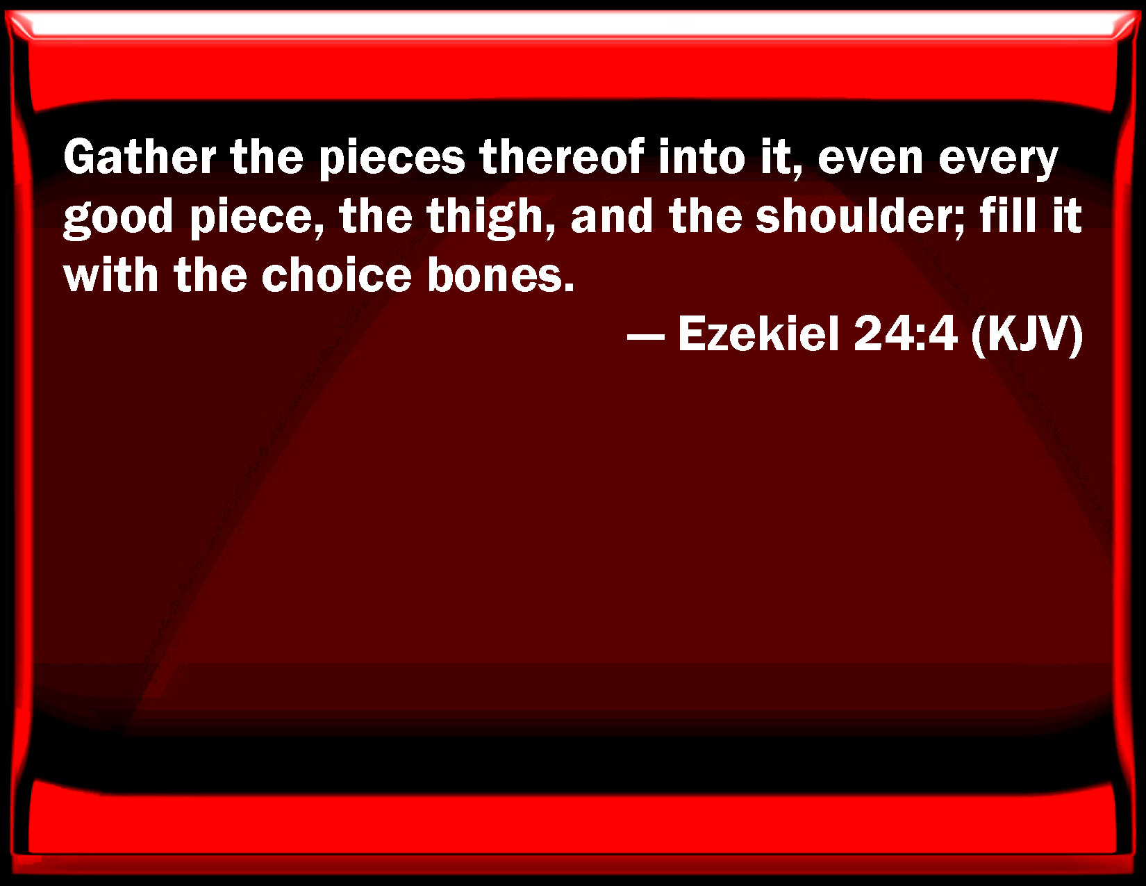 Bible Verse Slide Ezekiel 24:4 Gather the pieces thereof into it, even every good piece, the thigh, and the shoulder; fill it with the choice bones. KJV: Gather the pieces thereof into it, even every good piece, the thigh, and the shoulder; fill it with the choice bones. DRB: Heap together into if the pieces thereof, every good piece, the thigh and the shoulder, choice pieces and full of bones. DBT: Gather the pieces thereof into it, every good piece, the thigh and the shoulder; fill it with the choice bones: ERV: gather the pieces thereof into it, even every good piece, the thigh, and the shoulder; fill it with the choice bones. WBT: Gather its pieces into it, even every good piece, the thigh, and the shoulder; fill it with the choice bones. WEB: gather its pieces into it, even every good piece, the thigh, and the shoulder; fill it with the choice bones. YLT: To gather its pieces unto it, every good piece, Thigh and shoulder, the choice of the bones to fill in.Links Ezekiel 24:4 NIV • Ezekiel 24:4 NLT • Ezekiel 24:4 ESV • Ezekiel 24:4 NASB • Ezekiel 24:4 KJV • Ezekiel 24:4 Interlinear • Ezekiel 24:4 Commentaries • Ezekiel 24:4 Parallel Texts • Ezekiel 24:4 Bible Apps • Ezekiel 24:4 Parallel • Bible Hub |