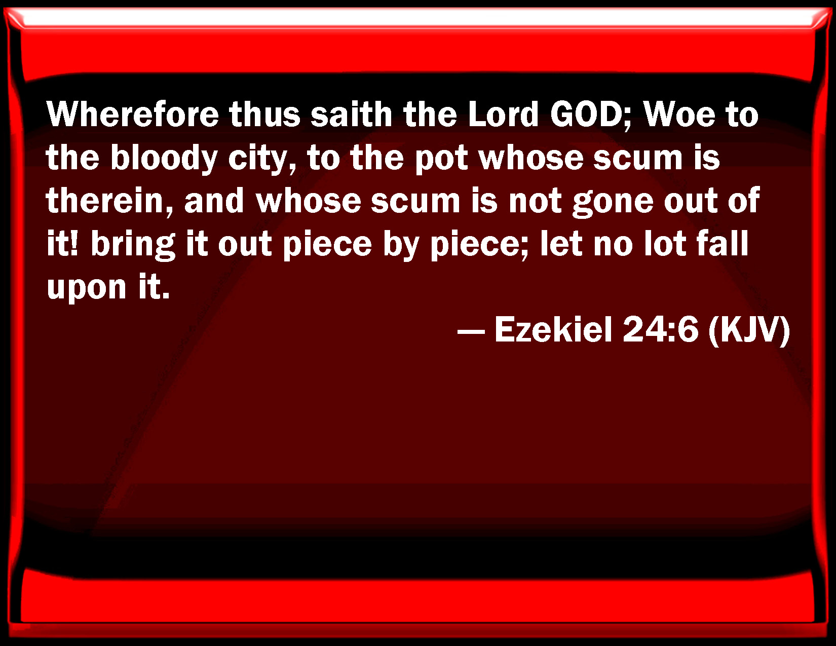 Bible Verse Slide Ezekiel 24:6 Why thus said the Lord GOD; Woe to the bloody city, to the pot whose scum is therein, and whose scum is not gone out of it! bring it out piece by piece; let no lot fall on it. KJV: Wherefore thus saith the Lord GOD; Woe to the bloody city, to the pot whose scum is therein, and whose scum is not gone out of it! bring it out piece by piece; let no lot fall upon it. DRB: Therefore thus saith the Lord God: Woe to the bloody city, to the pot whose rust is in it, and its rust is not gone out of it: cast it out piece by piece, there hath no lot fallen upon it. DBT: Therefore thus saith the Lord Jehovah: Woe to the bloody city, to the pot whose rust is therein, and whose rust is not gone out of it! Bring it out piece by piece; let no lot fall upon it: ERV: Wherefore thus saith the Lord GOD: Woe to the bloody city, to the caldron whose rust is therein, and whose rust is not gone out of it! bring it out piece by piece; no lot is fallen upon it. WBT: Wherefore thus saith the Lord GOD; Woe to the bloody city, to the pot whose scum is therein, and whose scum is not gone out of it! bring it out piece by piece; let no lot fall upon it. WEB: Therefore thus says the Lord Yahweh: Woe to the bloody city, to the caldron whose rust is therein, and whose rust is not gone out of it! take out of it piece after piece; No lot is fallen on it. YLT: Therefore, thus said the Lord Jehovah: Woe to the city of blood, A pot whose scum is in it, And its scum hath not come out of it, By piece of it, by piece of it bring it out, Not fallen on it hath a lot.Links Ezekiel 24:6 NIV • Ezekiel 24:6 NLT • Ezekiel 24:6 ESV • Ezekiel 24:6 NASB • Ezekiel 24:6 KJV • Ezekiel 24:6 Interlinear • Ezekiel 24:6 Commentaries • Ezekiel 24:6 Parallel Texts • Ezekiel 24:6 Bible Apps • Ezekiel 24:6 Parallel • Bible Hub |