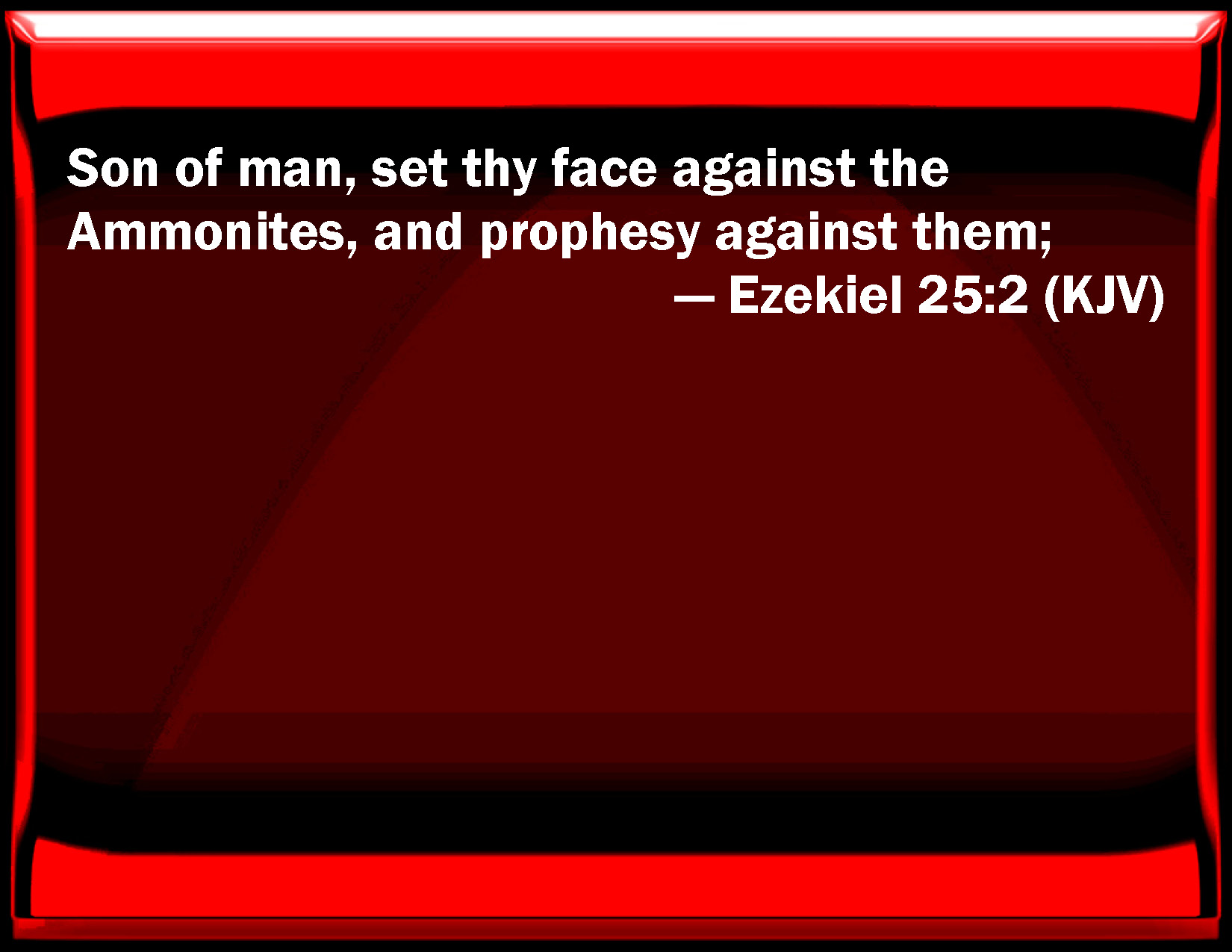 Bible Verse Slide Ezekiel 25:2 Son of man, set your face against the Ammonites, and prophesy against them; KJV: Son of man, set thy face against the Ammonites, and prophesy against them; DRB: Son of man, set thy face against the children of Ammon, and thou shalt prophesy of them. DBT: Son of man, set thy face against the children of Ammon, and prophesy against them; ERV: Son of man, set thy face toward the children of Ammon, and prophesy against them: WBT: Son of man, set thy face against the Ammonites, and prophesy against them; WEB: Son of man, set your face toward the children of Ammon, and prophesy against them: YLT: 'Son of man, set thy face unto the sons of Ammon, and prophesy against them;Links Ezekiel 25:2 NIV • Ezekiel 25:2 NLT • Ezekiel 25:2 ESV • Ezekiel 25:2 NASB • Ezekiel 25:2 KJV • Ezekiel 25:2 Interlinear • Ezekiel 25:2 Commentaries • Ezekiel 25:2 Parallel Texts • Ezekiel 25:2 Bible Apps • Ezekiel 25:2 Parallel • Bible Hub |