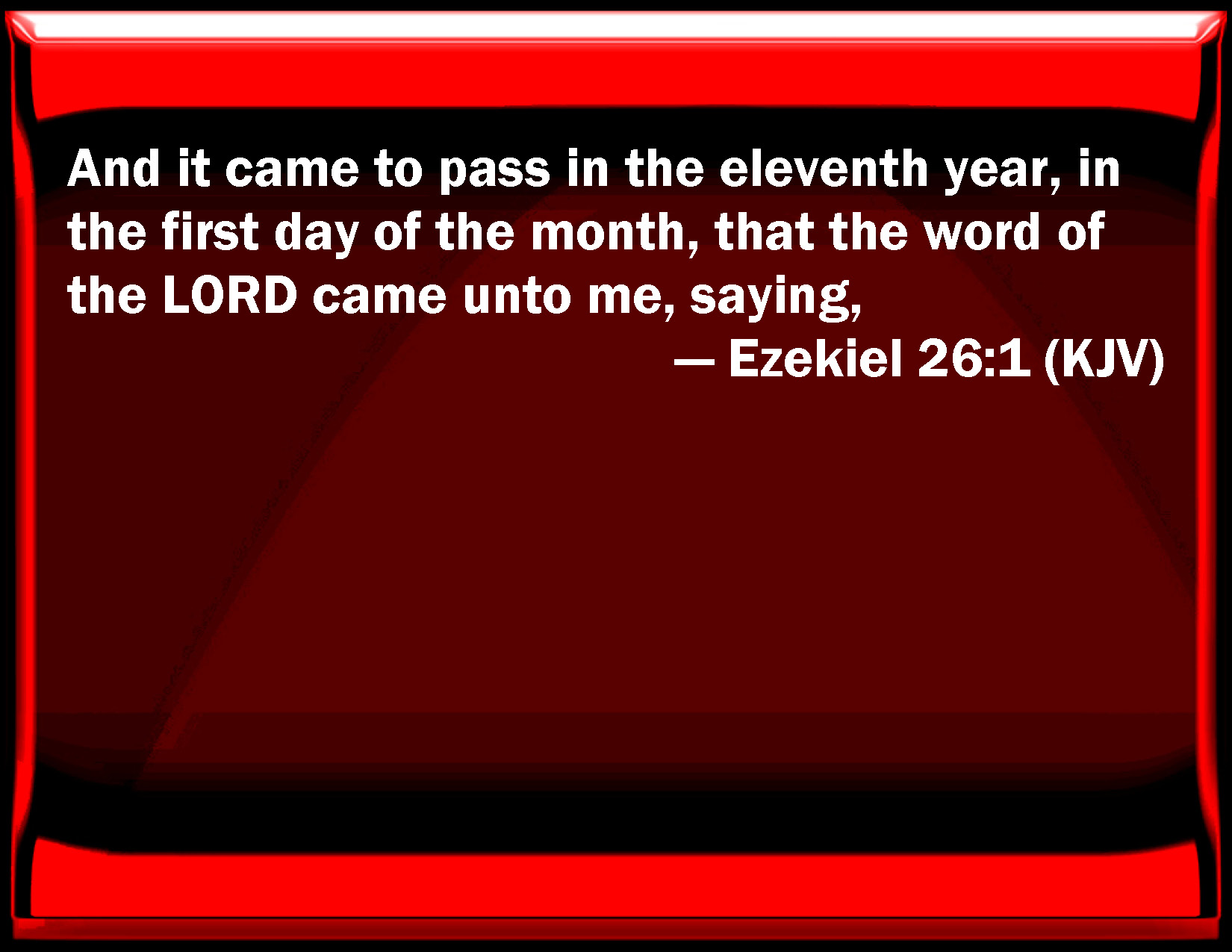 Bible Verse Slide Ezekiel 26:1 And it came to pass in the eleventh year, in the first day of the month, that the word of the LORD came to me, saying, KJV: And it came to pass in the eleventh year, in the first day of the month, that the word of the LORD came unto me, saying, DRB: And it came to pass in the eleventh year, the first day of the month, that the word of the Lord came to me, saying: DBT: And it came to pass in the eleventh year, on the first of the month, that the word of Jehovah came unto me, saying, ERV: And it came to pass in the eleventh year, in the first day of the month, that the word of the Lord came unto me, saying, WBT: And it came to pass in the eleventh year, in the first day of the month, that the word of the LORD came to me, saying, WEB: It happened in the eleventh year, in the first [day] of the month, that the word of Yahweh came to me, saying, YLT: And it cometh to pass, in the eleventh year, in the first of the month, there hath been a word of Jehovah unto me, saying: 'Son of man,Links Ezekiel 26:1 NIV • Ezekiel 26:1 NLT • Ezekiel 26:1 ESV • Ezekiel 26:1 NASB • Ezekiel 26:1 KJV • Ezekiel 26:1 Interlinear • Ezekiel 26:1 Commentaries • Ezekiel 26:1 Parallel Texts • Ezekiel 26:1 Bible Apps • Ezekiel 26:1 Parallel • Bible Hub |