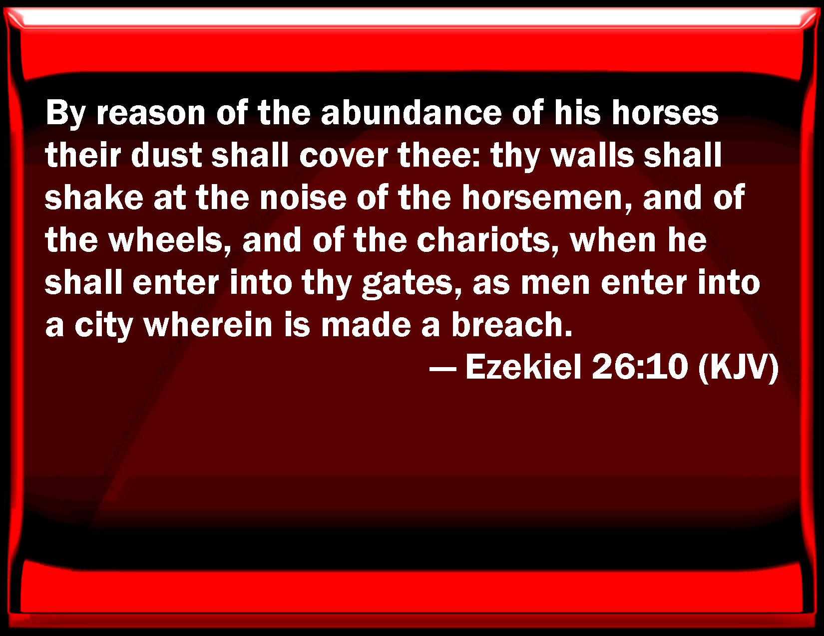 Bible Verse Slide Ezekiel 26:10 By reason of the abundance of his horses their dust shall cover you: your walls shall shake at the noise of the horsemen, and of the wheels, and of the chariots, when he shall enter into your gates, as men enter into a city wherein is made a breach. KJV: By reason of the abundance of his horses their dust shall cover thee: thy walls shall shake at the noise of the horsemen, and of the wheels, and of the chariots, when he shall enter into thy gates, as men enter into a city wherein is made a breach. DRB: By reason of the multitude of his horses, their dust shall cover thee: thy walls shall shake at the noise of the horsemen, and wheels, and chariots, when they shall go in at thy gates, as by the entrance of a city that is destroyed. DBT: By reason of the abundance of his horses their dust shall cover thee; thy walls shall shake at the noise of the horsemen, and of the wheels, and of the chariots, when he shall enter through thy gates, as a city is entered into, wherein is made a breach. ERV: By reason of the abundance of his horses their dust shall cover thee: thy walls shall shake at the noise of the horsemen, and of the wagons, and of the chariots, when he shall enter into thy gates, as men enter into a city wherein is made a breach. WBT: By reason of the abundance of his horses their dust shall cover thee: thy walls shall shake at the noise of the horsemen, and of the wheels, and of the chariots, when he shall enter into thy gates, as men enter into a city in which is made a breach. WEB: By reason of the abundance of his horses their dust shall cover you: your walls shall shake at the noise of the horsemen, and of the wagons, and of the chariots, when he shall enter into your gates, as men enter into a city in which is made a breach. YLT: From the abundance of his horses cover thee doth their dust, From the noise of horseman, and wheel, and rider, Shake do thy walls, in his coming in to thy gates, As the coming into a city broken-up.Links Ezekiel 26:10 NIV • Ezekiel 26:10 NLT • Ezekiel 26:10 ESV • Ezekiel 26:10 NASB • Ezekiel 26:10 KJV • Ezekiel 26:10 Interlinear • Ezekiel 26:10 Commentaries • Ezekiel 26:10 Parallel Texts • Ezekiel 26:10 Bible Apps • Ezekiel 26:10 Parallel • Bible Hub |