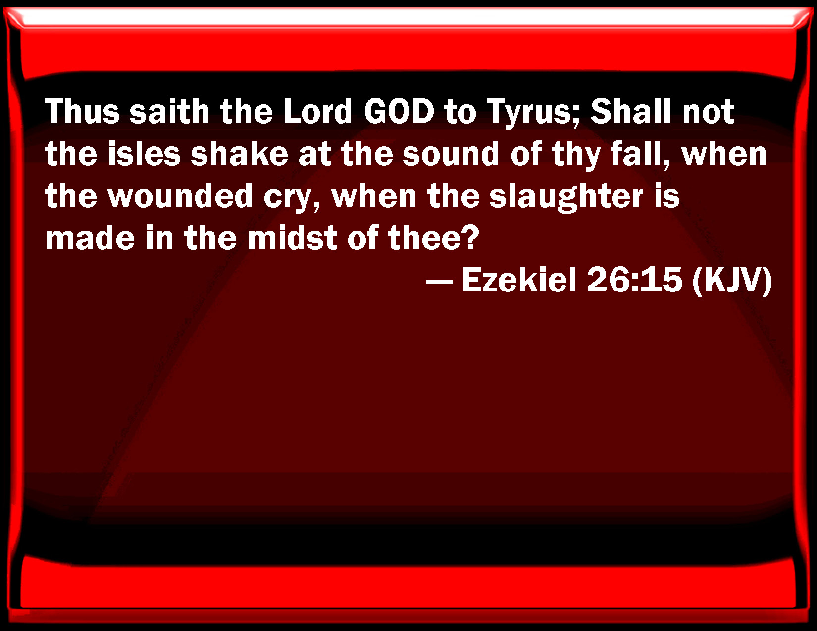 Bible Verse Slide Ezekiel 26:15 Thus said the Lord GOD to Tyrus; Shall not the isles shake at the sound of your fall, when the wounded cry, when the slaughter is made in the middle of you? KJV: Thus saith the Lord GOD to Tyrus; Shall not the isles shake at the sound of thy fall, when the wounded cry, when the slaughter is made in the midst of thee? DRB: Thus saith the Lord God to Tyre: Shall not the islands shake at the sound of thy fall, and the groans of thy slain when they shall be killed in the midst of thee? DBT: Thus saith the Lord Jehovah to Tyre: Shall not the isles shake at the sound of thy fall, when the wounded groan, when the slaughter is made in the midst of thee? ERV: Thus saith the Lord GOD to Tyre: Shall not the isles shake at the sound of thy fall, when the wounded groan, when the slaughter is made in the midst of thee? WBT: Thus saith the Lord GOD to Tyre; Shall not the isles shake at the sound of thy fall, when the wounded cry, when the slaughter is made in the midst of thee? WEB: Thus says the Lord Yahweh to Tyre: shall not the islands shake at the sound of your fall, when the wounded groan, when the slaughter is made in the midst of you? YLT: Thus said the Lord Jehovah to Tyre: Do not — from the noise of thy fall, In the groaning of the wounded, In the slaying of the slaughter in thy midst, The isles shake?Links Ezekiel 26:15 NIV • Ezekiel 26:15 NLT • Ezekiel 26:15 ESV • Ezekiel 26:15 NASB • Ezekiel 26:15 KJV • Ezekiel 26:15 Interlinear • Ezekiel 26:15 Commentaries • Ezekiel 26:15 Parallel Texts • Ezekiel 26:15 Bible Apps • Ezekiel 26:15 Parallel • Bible Hub |