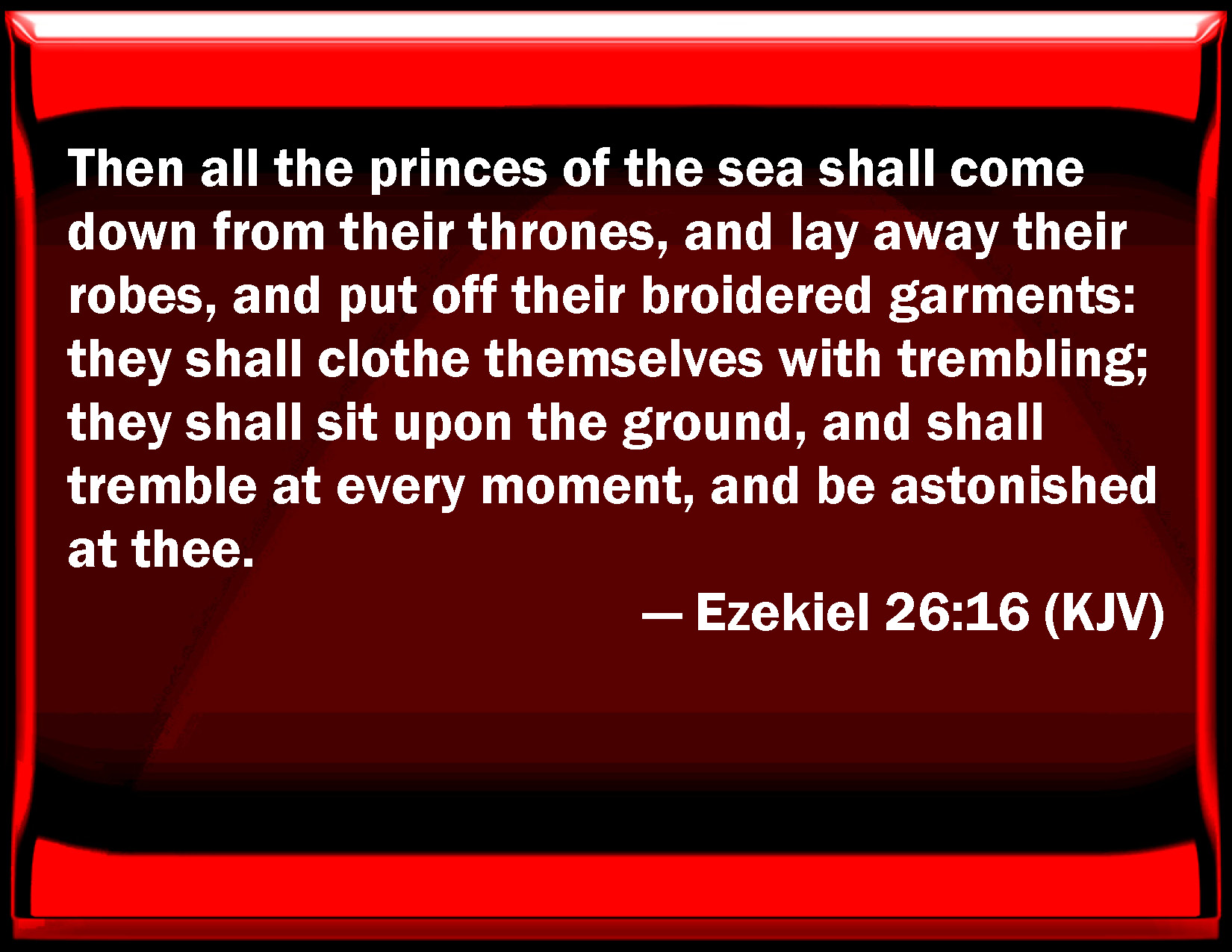 Bible Verse Slide Ezekiel 26:16 Then all the princes of the sea shall come down from their thrones, and lay away their robes, and put off their broidered garments: they shall clothe themselves with trembling; they shall sit on the ground, and shall tremble at every moment, and be astonished at you. KJV: Then all the princes of the sea shall come down from their thrones, and lay away their robes, and put off their broidered garments: they shall clothe themselves with trembling; they shall sit upon the ground, and shall tremble at every moment, and be astonished at thee. DRB: Then all the princes of the sea shall come down from their thrones: and take off their robes, and cast away their broidered garments, and be clothed with astonishment: they shall sit on the ground, and with amazement shall wonder at thy sudden fall. DBT: And all the princes of the sea shall come down from their thrones, and lay aside their robes, and put off their broidered garments: they shall clothe themselves with trembling, they shall sit upon the ground, and shall tremble every moment, and be astonied because of thee. ERV: Then all the princes of the sea shall come down from their thrones, and lay aside their robes, and strip off their broidered garments: they shall clothe themselves with trembling; they shall sit upon the ground, and shall tremble every moment, and be astonished at thee. WBT: Then all the princes of the sea shall come down from their thrones, and lay away their robes, and put off their broidered garments: they shall clothe themselves with trembling; they shall sit upon the ground, and shall tremble at every moment, and be astonished at thee. WEB: Then all the princes of the sea shall come down from their thrones, and lay aside their robes, and strip off their embroidered garments: they shall clothe themselves with trembling; they shall sit on the ground, and shall tremble every moment, and be astonished at you. YLT: And come down from off their thrones have all princes of the sea, And they have turned aside their robes, And their embroidered garments strip off, Trembling they put on, on the earth they sit, And they have trembled every moment, And they have been astonished at thee,Links Ezekiel 26:16 NIV • Ezekiel 26:16 NLT • Ezekiel 26:16 ESV • Ezekiel 26:16 NASB • Ezekiel 26:16 KJV • Ezekiel 26:16 Interlinear • Ezekiel 26:16 Commentaries • Ezekiel 26:16 Parallel Texts • Ezekiel 26:16 Bible Apps • Ezekiel 26:16 Parallel • Bible Hub |