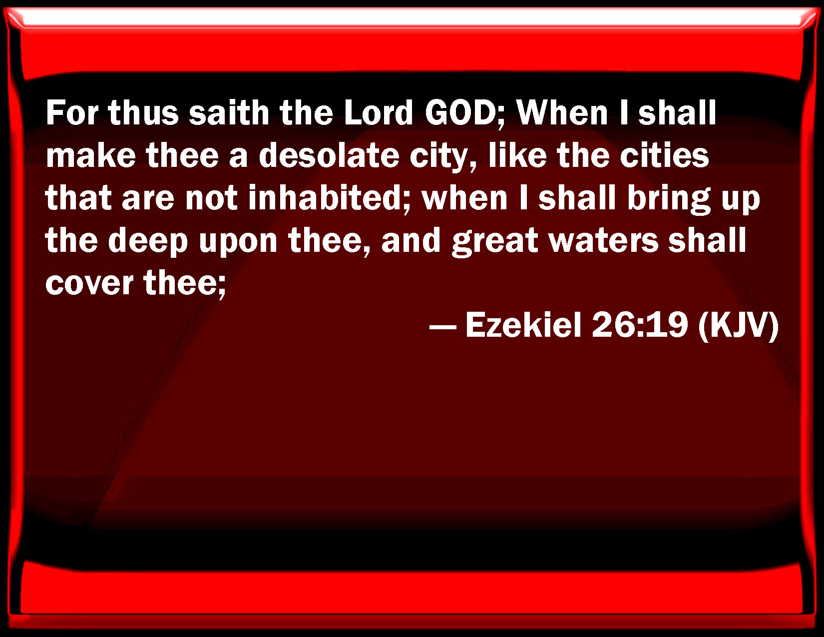 WBT:  For thus saith the Lord GOD; When I shall make thee a desolate city, like the cities that are not inhabited; when I shall bring up the deep upon thee, and great waters shall cover thee;