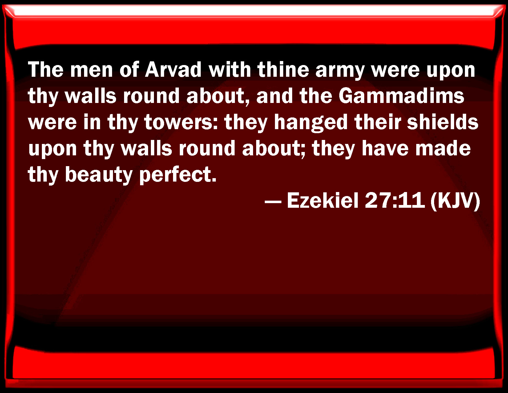 Bible Verse Slide Ezekiel 27:11 The men of Arvad with your army were on your walls round about, and the Gammadims were in your towers: they hanged their shields on your walls round about; they have made your beauty perfect. KJV: The men of Arvad with thine army were upon thy walls round about, and the Gammadims were in thy towers: they hanged their shields upon thy walls round about; they have made thy beauty perfect. DRB: The men of Arad were with thy army upon thy walls round about: the Pygmeans also that were in thy towers, hung up their quivers on thy walls round about: they perfected thy beauty. DBT: The children of Arvad with thine army were upon thy walls round about, and the Gammadim were on thy towers: they hanged their shields upon thy walls round about; they made thy beauty perfect. ERV: The men of Arvad with thine army were upon thy walls round about, and the Gammadim were in thy towers: they hanged their shields upon thy walls round about; they have perfected thy beauty. WBT: The men of Arvad with thy army were upon thy walls on all sides, and the Gammadims were in thy towers: they hung their shields upon thy walls on every side; they have made thy beauty perfect. WEB: The men of Arvad with your army were on your walls all around, and valorous men were in your towers; they hanged their shields on your walls all around; they have perfected your beauty. YLT: The sons of Arvad, and thy force, Are on thy walls round about, And short swordsmen in thy towers have been, Their shields they have hung up on thy walls round about, They — they have perfected thy beauty.Links Ezekiel 27:11 NIV • Ezekiel 27:11 NLT • Ezekiel 27:11 ESV • Ezekiel 27:11 NASB • Ezekiel 27:11 KJV • Ezekiel 27:11 Interlinear • Ezekiel 27:11 Commentaries • Ezekiel 27:11 Parallel Texts • Ezekiel 27:11 Bible Apps • Ezekiel 27:11 Parallel • Bible Hub |