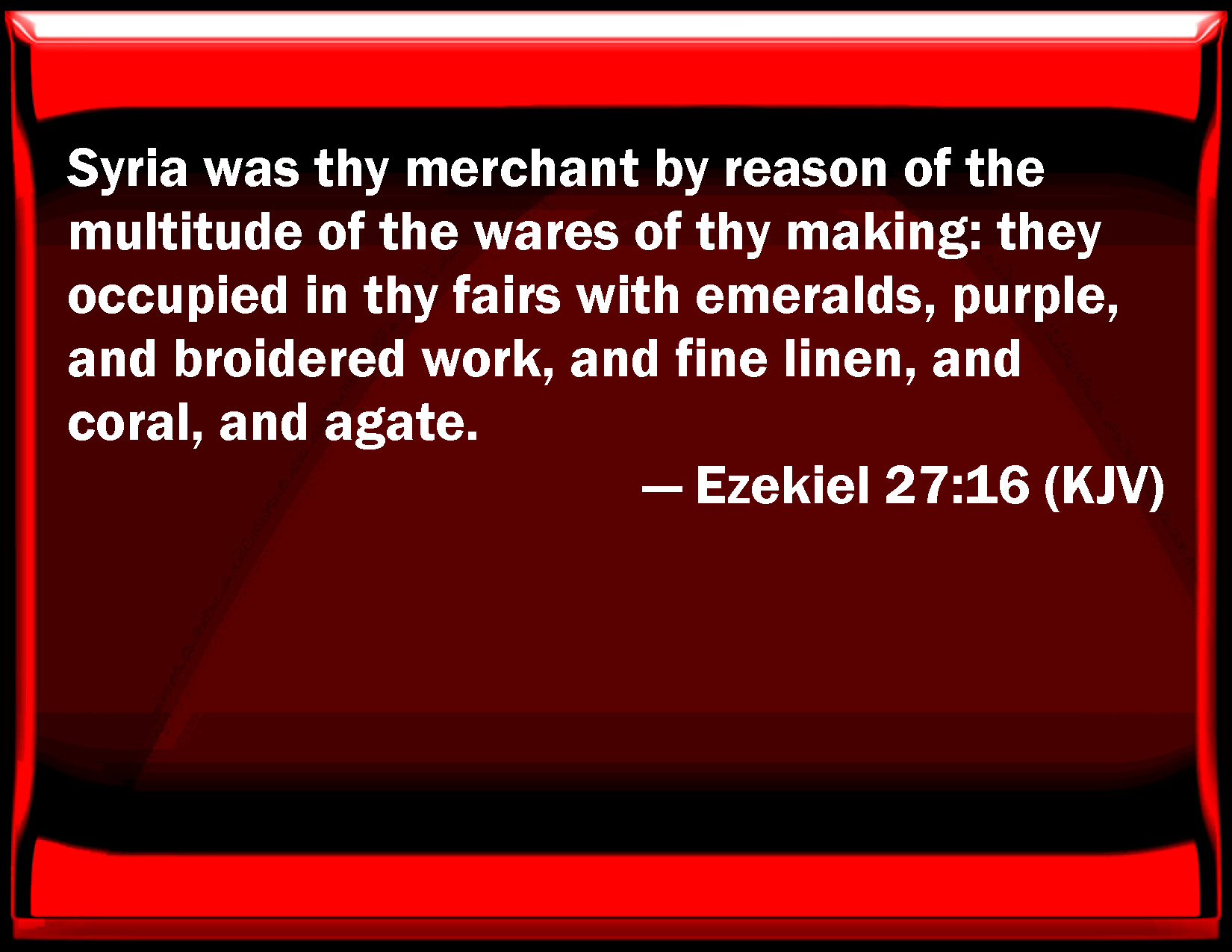 Bible Verse Slide Ezekiel 27:16 Syria was your merchant by reason of the multitude of the wares of your making: they occupied in your fairs with emeralds, purple, and broidered work, and fine linen, and coral, and agate. KJV: Syria was thy merchant by reason of the multitude of the wares of thy making: they occupied in thy fairs with emeralds, purple, and broidered work, and fine linen, and coral, and agate. DRB: The Syrian was thy merchant: by reason of the multitude of thy works, they set forth precious stones, and purple, and broidered works, and fine linen, and silk, and chodchod in thy market. DBT: Syria dealt with thee for the multitude of thy handiworks: they traded in thy markets with carbuncles, purple, and broidered work, and fine linen, and corals, and rubies. ERV: Syria was thy merchant by reason of the multitude of thy handyworks: they traded for thy wares with emeralds, purple, and broidered work, and fine linen, and coral, and rubies. WBT: Syria was thy merchant by reason of the multitude of the wares of thy making: they occupied in thy fairs with emeralds, purple, and broidered work, and fine linen, and coral, and agate. WEB: Syria was your merchant by reason of the multitude of your handiworks: they traded for your wares with emeralds, purple, and embroidered work, and fine linen, and coral, and rubies. YLT: Aram is thy merchant, Because of the abundance of thy works, For emerald, purple, and embroidery, And fine linen, and coral, and agate, They have given out thy remnants.Links Ezekiel 27:16 NIV • Ezekiel 27:16 NLT • Ezekiel 27:16 ESV • Ezekiel 27:16 NASB • Ezekiel 27:16 KJV • Ezekiel 27:16 Interlinear • Ezekiel 27:16 Commentaries • Ezekiel 27:16 Parallel Texts • Ezekiel 27:16 Bible Apps • Ezekiel 27:16 Parallel • Bible Hub |