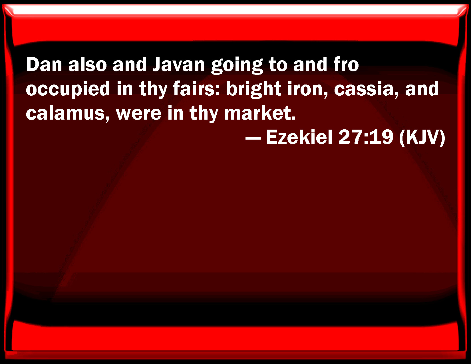 Bible Verse Slide Ezekiel 27:19 Dan also and Javan going to and fro occupied in your fairs: bright iron, cassia, and calamus, were in your market. KJV: Dan also and Javan going to and fro occupied in thy fairs: bright iron, cassia, and calamus, were in thy market. DRB: Dan, and Greece, and Mosel have set forth in thy marts wrought iron: stacte, and calamus were in thy market. DBT: Vedan and Javan of Uzal traded in thy markets: wrought iron, cassia, and calamus were in thy traffic. ERV: Vedan and Javan traded with yarn for thy wares: bright iron, cassia, and calamus, were among thy merchandise. WBT: Dan also and Javan going to and fro occupied in thy fairs: bright iron, cassia, and calamus, were in thy market. WEB: Vedan and Javan traded with yarn for your wares: bright iron, cassia, and calamus, were among your merchandise. YLT: Vedan and Javan go about with thy remnants, They have given shining iron, cassia, and cane, In thy merchandise it hath been.Links Ezekiel 27:19 NIV • Ezekiel 27:19 NLT • Ezekiel 27:19 ESV • Ezekiel 27:19 NASB • Ezekiel 27:19 KJV • Ezekiel 27:19 Interlinear • Ezekiel 27:19 Commentaries • Ezekiel 27:19 Parallel Texts • Ezekiel 27:19 Bible Apps • Ezekiel 27:19 Parallel • Bible Hub |
