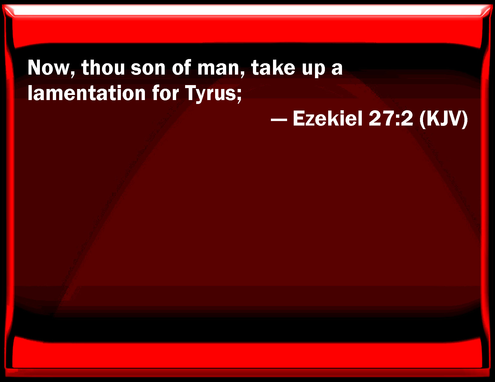 Bible Verse Slide Ezekiel 27:2 Now, you son of man, take up a lamentation for Tyrus; KJV: Now, thou son of man, take up a lamentation for Tyrus; DRB: Thou therefore, O son of man, take up a lamentation for Tyre: DBT: And thou, son of man, take up a lamentation for Tyre, ERV: And thou, son of man, take up a lamentation for Tyre; WBT: Now, thou son of man, take up a lamentation for Tyre; WEB: You, son of man, take up a lamentation over Tyre; YLT: 'And thou, son of man, lift up concerning Tyre a lamentation, and thou hast said to Tyre:Links Ezekiel 27:2 NIV • Ezekiel 27:2 NLT • Ezekiel 27:2 ESV • Ezekiel 27:2 NASB • Ezekiel 27:2 KJV • Ezekiel 27:2 Interlinear • Ezekiel 27:2 Commentaries • Ezekiel 27:2 Parallel Texts • Ezekiel 27:2 Bible Apps • Ezekiel 27:2 Parallel • Bible Hub |