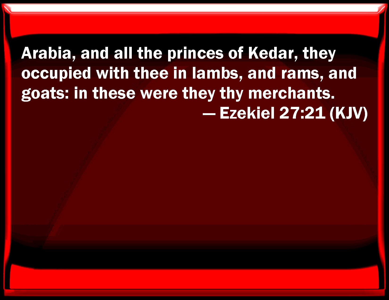 Bible Verse Slide Ezekiel 27:21 Arabia, and all the princes of Kedar, they occupied with you in lambs, and rams, and goats: in these were they your merchants. KJV: Arabia, and all the princes of Kedar, they occupied with thee in lambs, and rams, and goats: in these were they thy merchants. DRB: Arabia, and all the princes of Cedar, they were the merchants of thy hand: thy merchants came to thee with lambs, and rants, and kids. DBT: Arabia and all the princes of Kedar were the merchants of thy hand: in lambs, and rams, and goats, in these did they trade with thee. ERV: Arabia, and all the princes of Kedar, they were the merchants of thy hand; in lambs, and rams, and goats, in these were they thy merchants. WBT: Arabia, and all the princes of Kedar, they occupied with thee in lambs, and rams, and goats: in these were they thy merchants. WEB: Arabia, and all the princes of Kedar, they were the merchants of your hand; in lambs, and rams, and goats, in these were they your merchants. YLT: Arabia, and all princes of Kedar, They are the traders of thy hand, For lambs, and rams, and he-goats, In these thy merchants.Links Ezekiel 27:21 NIV • Ezekiel 27:21 NLT • Ezekiel 27:21 ESV • Ezekiel 27:21 NASB • Ezekiel 27:21 KJV • Ezekiel 27:21 Interlinear • Ezekiel 27:21 Commentaries • Ezekiel 27:21 Parallel Texts • Ezekiel 27:21 Bible Apps • Ezekiel 27:21 Parallel • Bible Hub |