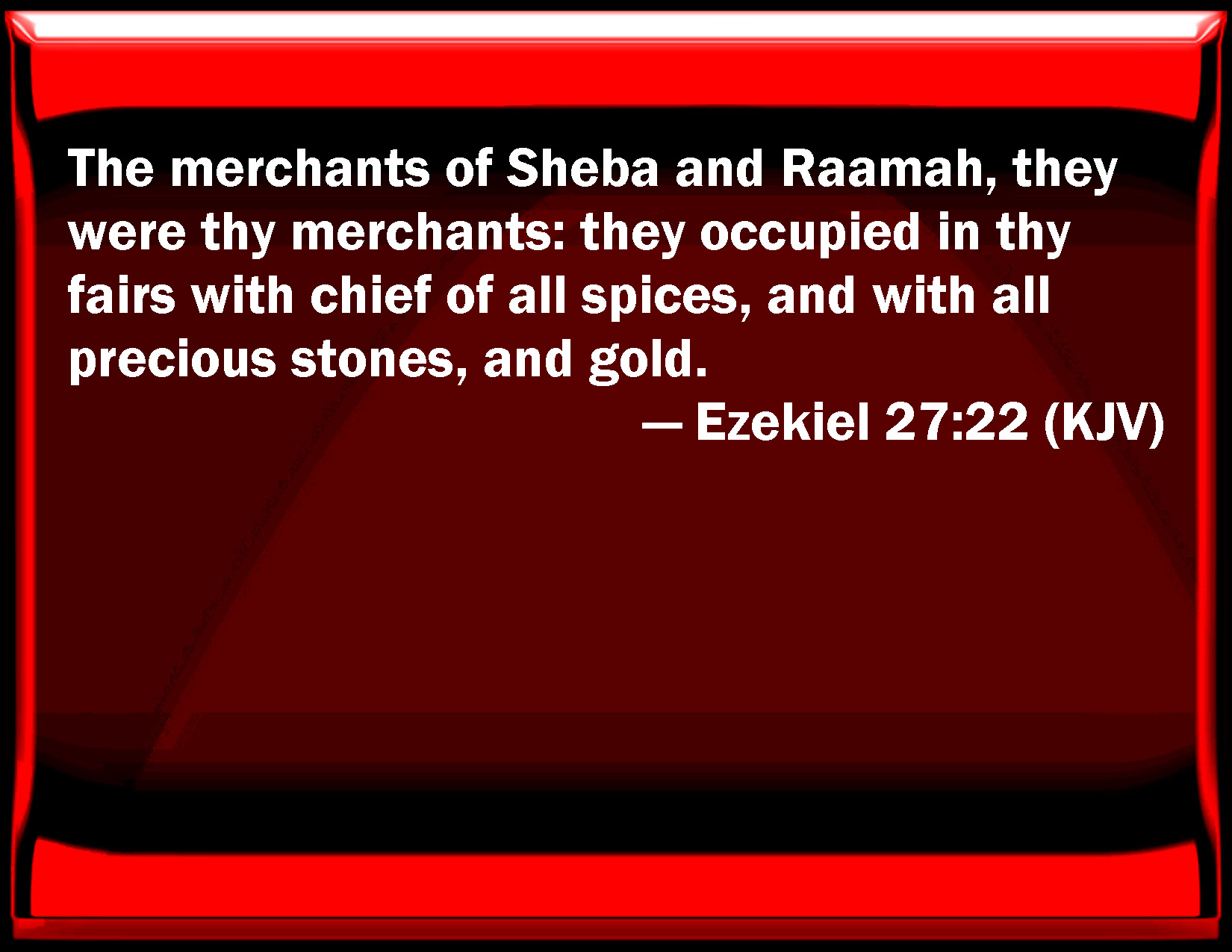 Bible Verse Slide Ezekiel 27:22 The merchants of Sheba and Raamah, they were your merchants: they occupied in your fairs with chief of all spices, and with all precious stones, and gold. KJV: The merchants of Sheba and Raamah, they were thy merchants: they occupied in thy fairs with chief of all spices, and with all precious stones, and gold. DRB: The sellers of Saba, and Reema, they were thy merchants: with all the best spices, and precious stones, and gold, which they set forth in thy market. DBT: The merchants of Sheba and Raamah were thy traffickers: they furnished thy markets with all the choice spices, and with all precious stones and gold. ERV: The traffickers of Sheba and Raamah, they were thy traffickers: they traded for thy wares with chief of all spices, and with all precious stones, and gold. WBT: The merchants of Sheba and Raamah, they were thy merchants: they occupied in thy fairs with chief of all spices, and with all precious stones, and gold. WEB: The traffickers of Sheba and Raamah, they were your traffickers; they traded for your wares with the chief of all spices, and with all precious stones, and gold. YLT: Merchants of Sheba and Raamah — they are thy merchants, For the chief of all spices, And for every precious stone, and gold, They have given out thy remnants.Links Ezekiel 27:22 NIV • Ezekiel 27:22 NLT • Ezekiel 27:22 ESV • Ezekiel 27:22 NASB • Ezekiel 27:22 KJV • Ezekiel 27:22 Interlinear • Ezekiel 27:22 Commentaries • Ezekiel 27:22 Parallel Texts • Ezekiel 27:22 Bible Apps • Ezekiel 27:22 Parallel • Bible Hub |