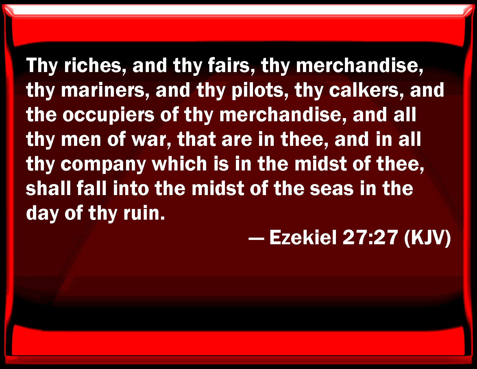 Bible Verse Slide Ezekiel 27:27 Your riches, and your fairs, your merchandise, your mariners, and your pilots, your caulkers, and the occupiers of your merchandise, and all your men of war, that are in you, and in all your company which is in the middle of you, shall fall into the middle of the seas in the day of your ruin. KJV: Thy riches, and thy fairs, thy merchandise, thy mariners, and thy pilots, thy calkers, and the occupiers of thy merchandise, and all thy men of war, that are in thee, and in all thy company which is in the midst of thee, shall fall into the midst of the seas in the day of thy ruin. DRB: Thy riches, and thy treasures, and thy manifold furniture, thy mariners, and thy pilots, who kept thy goods, and were chief over thy people: thy men of war also, that were in thee, with all thy multitude that is in the midst of thee: shall fall in the heart of the sea in the day of thy ruin. DBT: Thy substance, and thy markets, thy merchandise, thy mariners, and thy pilots, they that repair thy leaks, and they that barter with thee, and all thy men of war that are in thee, along with all thine assemblage which is in the midst of thee, shall fall into the heart of the seas in the day of thy fall. ERV: Thy riches, and thy wares, thy merchandise, thy mariners, and thy pilots, thy calkers, and the occupiers of thy merchandise, and all thy men of war, that are in thee, with all thy company which is in the midst of thee, shall fall into the heart of the seas in the day of thy ruin. WBT: Thy riches, and thy fairs, thy merchandise, thy mariners, and thy pilots, thy calkers, and the occupiers of thy merchandise, and all thy military men, that are in thee, and in all thy company which is in the midst of thee, shall fall into the midst of the seas in the day of thy ruin. WEB: Your riches, and your wares, your merchandise, your mariners, and your pilots, your repairers of ship seams, and the dealers in your merchandise, and all your men of war, who are in you, with all your company which is in the midst of you, shall fall into the heart of the seas in the day of your ruin. YLT: Thy wealth and thy remnants, Thy merchandise, thy mariners, And thy pilots, strengtheners of thy breach, And the traders of thy merchandise, And all thy men of war, who are in thee, And in all thine assembly that is in thy midst, Fall into the heart of the seas in the day of thy fall,Links Ezekiel 27:27 NIV • Ezekiel 27:27 NLT • Ezekiel 27:27 ESV • Ezekiel 27:27 NASB • Ezekiel 27:27 KJV • Ezekiel 27:27 Interlinear • Ezekiel 27:27 Commentaries • Ezekiel 27:27 Parallel Texts • Ezekiel 27:27 Bible Apps • Ezekiel 27:27 Parallel • Bible Hub |