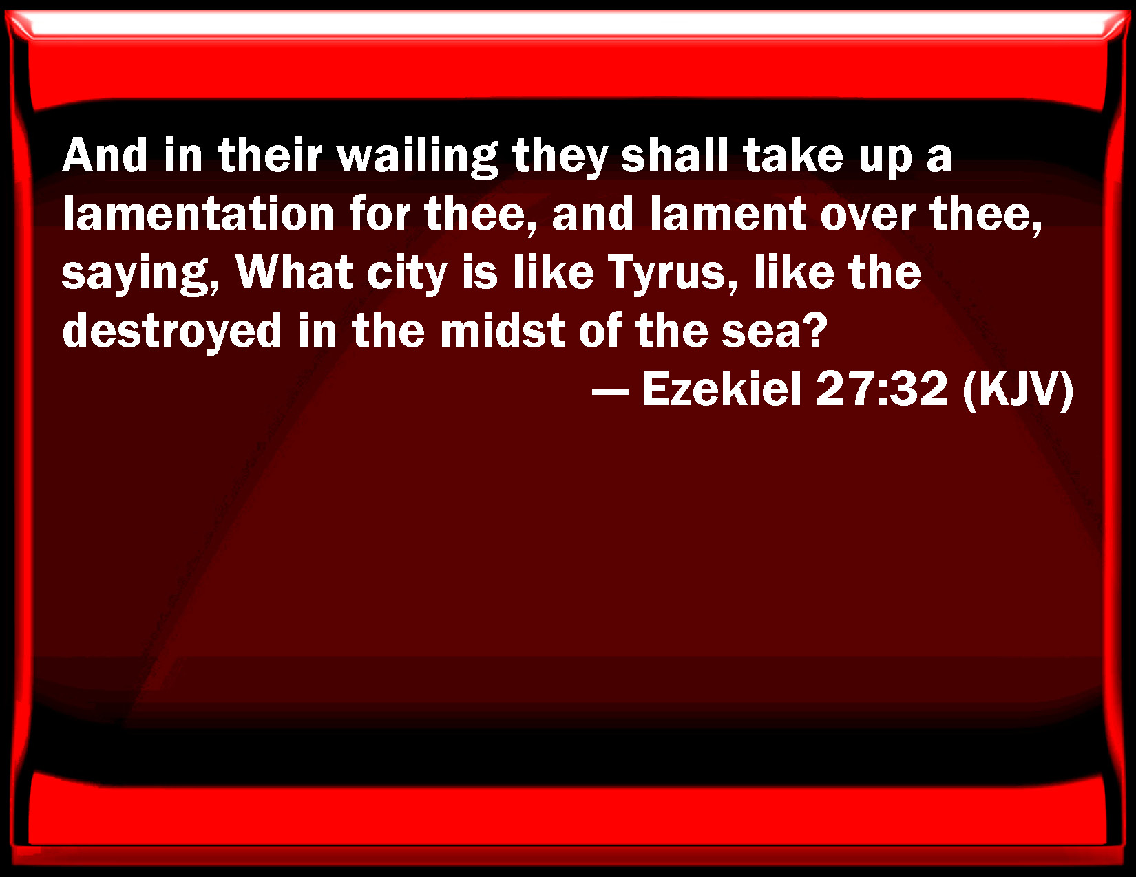 Bible Verse Slide Ezekiel 27:32 And in their wailing they shall take up a lamentation for you, and lament over you, saying, What city is like Tyrus, like the destroyed in the middle of the sea? KJV: And in their wailing they shall take up a lamentation for thee, and lament over thee, saying, What city is like Tyrus, like the destroyed in the midst of the sea? DRB: And they shall take up a mournful song for thee, and snail lament thee: What city is like Tyre, which is become silent in the midst of the sea? DBT: And in their wailing they shall take up a lamentation for thee, and lament over thee, saying, Who is like Tyre, like her that is destroyed in the midst of the sea? ERV: And in their wailing they shall take up a lamentation for thee, and lament over thee, saying, Who is there like Tyre, like her that is brought to silence in the midst of the sea? WBT: And in their wailing they shall take up a lamentation for thee, and lament over thee, saying, What city is like Tyre, like the destroyed in the midst of the sea? WEB: In their wailing they shall take up a lamentation for you, and lament over you, [saying], Who is there like Tyre, like her who is brought to silence in the midst of the sea? YLT: And lifted up for thee have their sons a lamentation, And they have lamented over thee, who is as Tyre? As the cut-off one in the midst of the sea?Links Ezekiel 27:32 NIV • Ezekiel 27:32 NLT • Ezekiel 27:32 ESV • Ezekiel 27:32 NASB • Ezekiel 27:32 KJV • Ezekiel 27:32 Interlinear • Ezekiel 27:32 Commentaries • Ezekiel 27:32 Parallel Texts • Ezekiel 27:32 Bible Apps • Ezekiel 27:32 Parallel • Bible Hub |