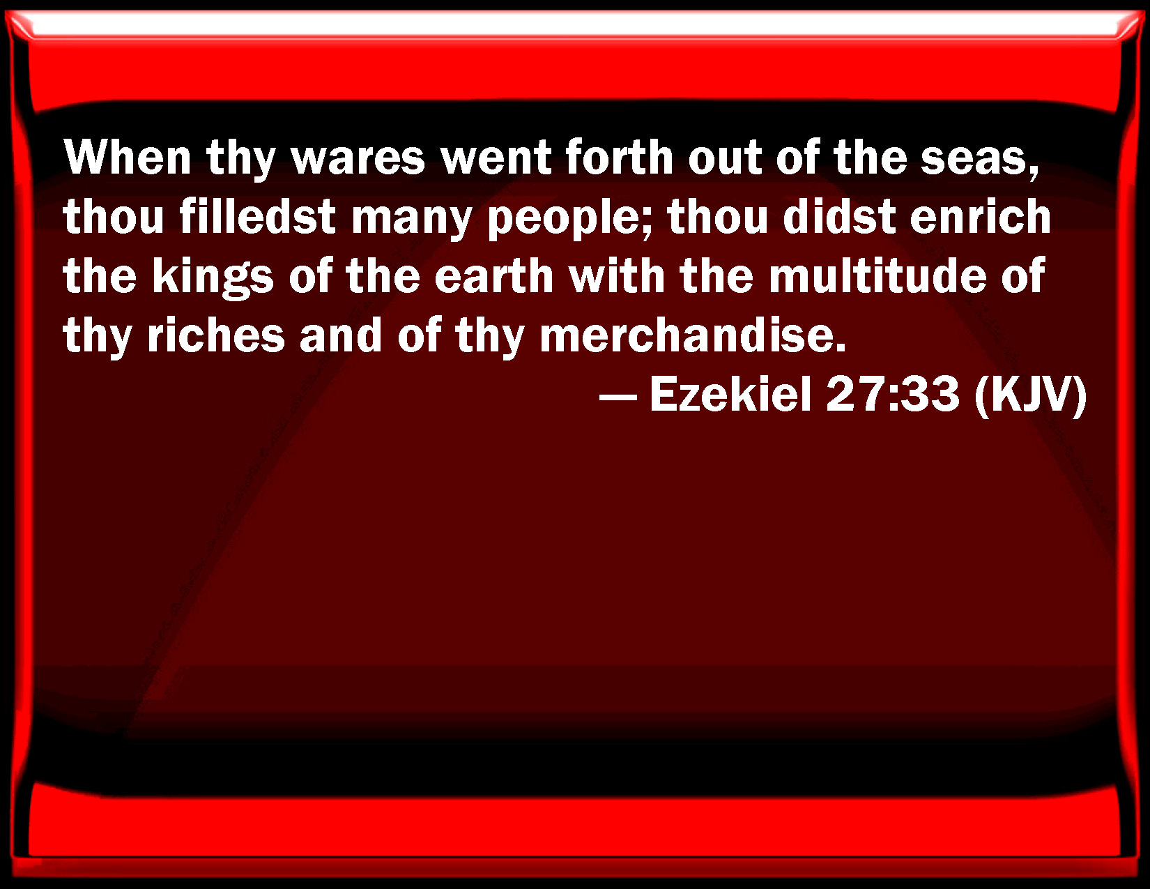 Bible Verse Slide Ezekiel 27:33 When your wares went forth out of the seas, you filled many people; you did enrich the kings of the earth with the multitude of your riches and of your merchandise. KJV: When thy wares went forth out of the seas, thou filledst many people; thou didst enrich the kings of the earth with the multitude of thy riches and of thy merchandise. DRB: Which by thy merchandise that went from thee by sea didst fill many people: which by the multitude of thy riches, and of thy people didst enrich the kings of the earth. DBT: When thy wares went forth over the seas, thou filledst many peoples; thou didst enrich the kings of the earth with the abundance of thy substance and of thy merchandise. ERV: When thy wares went forth out of the seas, thou filledst many peoples; thou didst enrich the kings of the earth with the multitude of thy riches and of thy merchandise. WBT: When thy wares went forth out of the seas, thou filledst many people; thou didst enrich the kings of the earth with the multitude of thy riches and of thy merchandise. WEB: When your wares went forth out of the seas, you filled many peoples; you did enrich the kings of the earth with the multitude of your riches and of your merchandise. YLT: With the outgoing of thy remnants from the seas, Thou hast filled many peoples, With the abundance of thy riches, and thy merchandise, Thou hast made rich things of earth.Links Ezekiel 27:33 NIV • Ezekiel 27:33 NLT • Ezekiel 27:33 ESV • Ezekiel 27:33 NASB • Ezekiel 27:33 KJV • Ezekiel 27:33 Interlinear • Ezekiel 27:33 Commentaries • Ezekiel 27:33 Parallel Texts • Ezekiel 27:33 Bible Apps • Ezekiel 27:33 Parallel • Bible Hub |