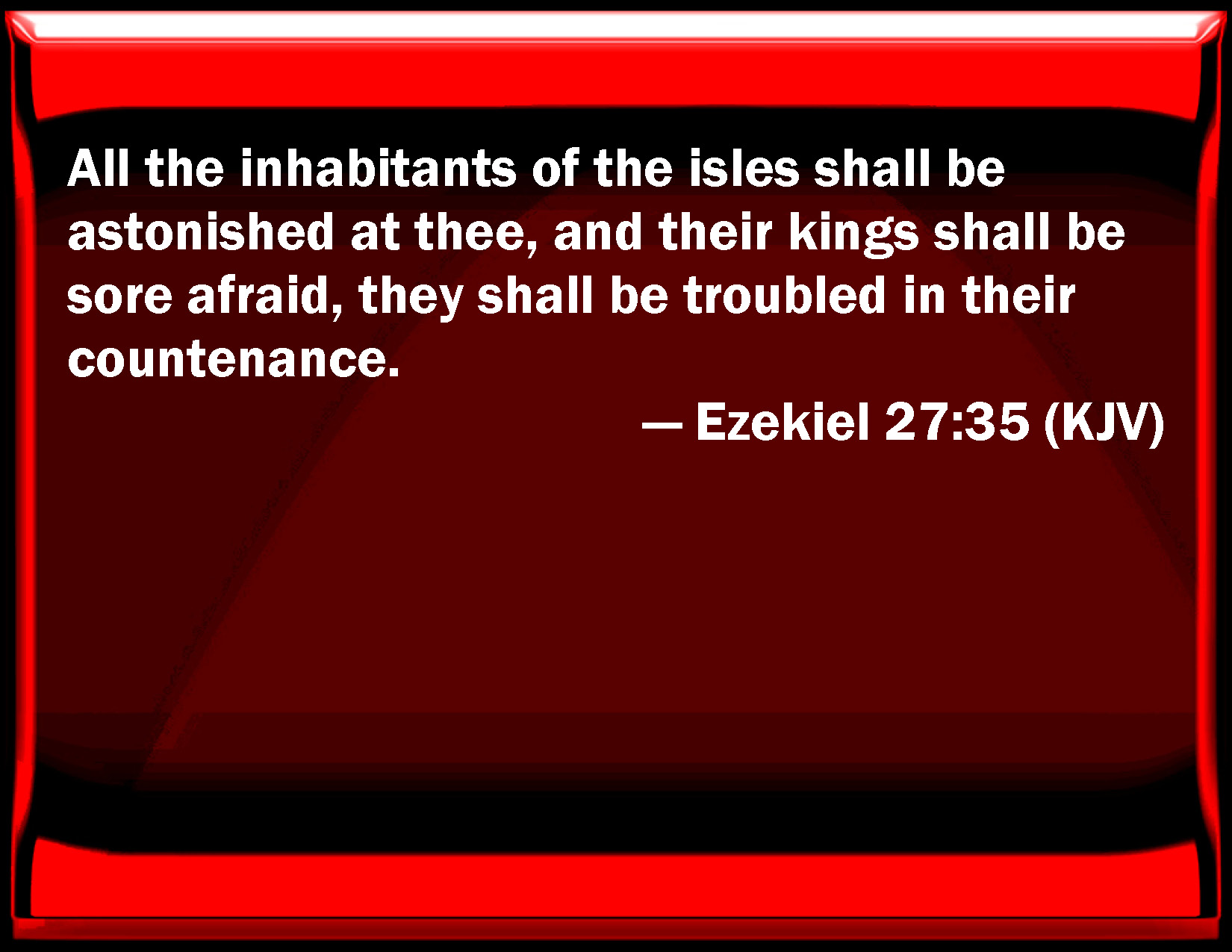 Bible Verse Slide Ezekiel 27:35 All the inhabitants of the isles shall be astonished at you, and their kings shall be sore afraid, they shall be troubled in their countenance. KJV: All the inhabitants of the isles shall be astonished at thee, and their kings shall be sore afraid, they shall be troubled in their countenance. DRB: All the inhabitants of the islands are astonished at thee: and all their kings being struck with the storm have changed their countenance. DBT: All the inhabitants of the isles are amazed at thee, and their kings are horribly afraid, their countenance is troubled. ERV: All the inhabitants of the isles are astonished at thee, and their kings are horribly afraid, they are troubled in their countenance. WBT: All the inhabitants of the isles shall be astonished at thee, and their kings shall be terribly afraid, they shall be troubled in their countenance. WEB: All the inhabitants of the islands are astonished at you, and their kings are horribly afraid; they are troubled in their face. YLT: All inhabitants of the isles have been astonished at thee, And their kings have been sore afraid, They have been troubled in countenance.Links Ezekiel 27:35 NIV • Ezekiel 27:35 NLT • Ezekiel 27:35 ESV • Ezekiel 27:35 NASB • Ezekiel 27:35 KJV • Ezekiel 27:35 Interlinear • Ezekiel 27:35 Commentaries • Ezekiel 27:35 Parallel Texts • Ezekiel 27:35 Bible Apps • Ezekiel 27:35 Parallel • Bible Hub |
