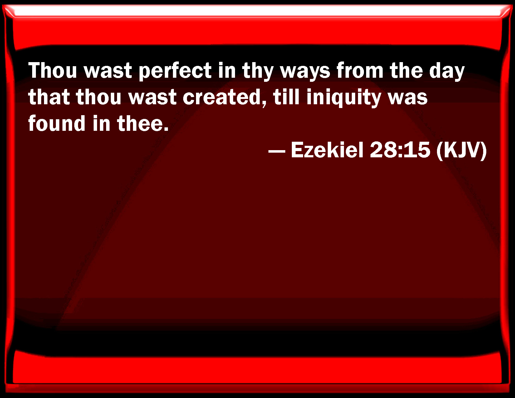 Bible Verse Slide Ezekiel 28:15 You were perfect in your ways from the day that you were created, till iniquity was found in you. KJV: Thou wast perfect in thy ways from the day that thou wast created, till iniquity was found in thee. DRB: Thou wast perfect in thy ways from the day of thy creation, until iniquity was found in thee. DBT: Thou wast perfect in thy ways, from the day that thou wast created, till unrighteousness was found in thee. ERV: Thou wast perfect in thy ways from the day that thou wast created, till unrighteousness was found in thee. WBT: Thou wast perfect in thy ways from the day that thou wast created, till iniquity was found in thee. WEB: You were perfect in your ways from the day that you were created, until unrighteousness was found in you. YLT: Perfect art thou in thy ways, From the day of thy being produced, Till perversity hath been found in thee.Links Ezekiel 28:15 NIV • Ezekiel 28:15 NLT • Ezekiel 28:15 ESV • Ezekiel 28:15 NASB • Ezekiel 28:15 KJV • Ezekiel 28:15 Interlinear • Ezekiel 28:15 Commentaries • Ezekiel 28:15 Parallel Texts • Ezekiel 28:15 Bible Apps • Ezekiel 28:15 Parallel • Bible Hub |