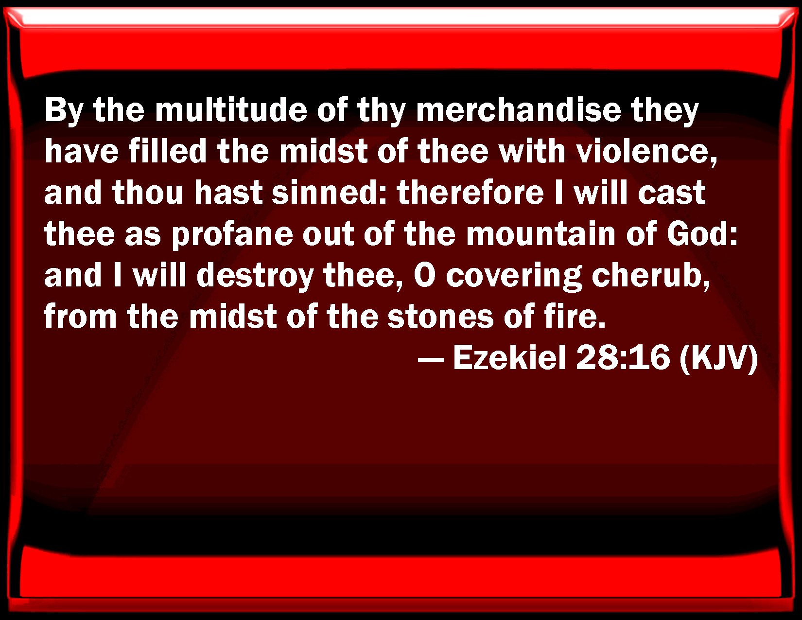 Bible Verse Slide Ezekiel 28:16 By the multitude of your merchandise they have filled the middle of you with violence, and you have sinned: therefore I will cast you as profane out of the mountain of God: and I will destroy you, O covering cherub, from the middle of the stones of fire. KJV: By the multitude of thy merchandise they have filled the midst of thee with violence, and thou hast sinned: therefore I will cast thee as profane out of the mountain of God: and I will destroy thee, O covering cherub, from the midst of the stones of fire. DRB: By the multitude of thy merchandise, thy inner parts were filled with iniquity, and thou hast sinned: and I cast thee out from the mountain of God, and destroyed thee, O covering cherub, out of the midst of the stones of fire. DBT: By the abundance of thy traffic they filled the midst of thee with violence, and thou hast sinned; therefore have I cast thee as profane from the mountain of God, and have destroyed thee, O covering cherub, from the midst of the stones of fire. ERV: By the multitude of they traffic they filled the midst of thee with violence, and thou hast sinned: therefore, have I cast thee as profane out of the mountain of God; and I have destroyed thee, O covering cherub, from the midst of the stones of fire. WBT: By the multitude of thy merchandise they have filled the midst of thee with violence, and thou hast sinned: therefore I will cast thee as profane out of the mountain of God: and I will destroy thee, O covering cherub, from the midst of the stones of fire. WEB: By the abundance of your traffic they filled the midst of you with violence, and you have sinned: therefore I have cast you as profane out of the mountain of God; and I have destroyed you, covering cherub, from the midst of the stones of fire. YLT: By the abundance of thy merchandise They have filled thy midst with violence, And thou dost sin, And I thrust thee from the mount of God, And I destroy thee, O covering cherub, From the midst of the stones of fire.Links Ezekiel 28:16 NIV • Ezekiel 28:16 NLT • Ezekiel 28:16 ESV • Ezekiel 28:16 NASB • Ezekiel 28:16 KJV • Ezekiel 28:16 Interlinear • Ezekiel 28:16 Commentaries • Ezekiel 28:16 Parallel Texts • Ezekiel 28:16 Bible Apps • Ezekiel 28:16 Parallel • Bible Hub |