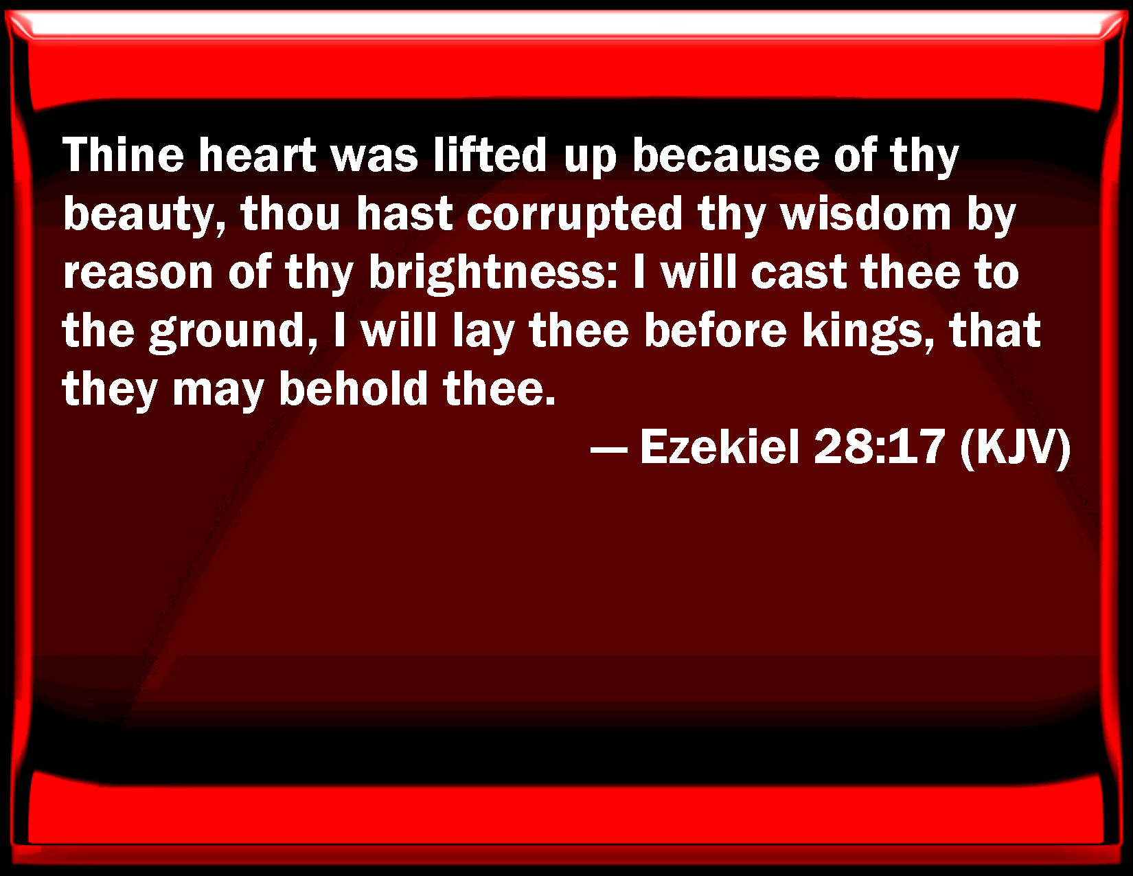 Bible Verse Slide Ezekiel 28:17 Your heart was lifted up because of your beauty, you have corrupted your wisdom by reason of your brightness: I will cast you to the ground, I will lay you before kings, that they may behold you. KJV: Thine heart was lifted up because of thy beauty, thou hast corrupted thy wisdom by reason of thy brightness: I will cast thee to the ground, I will lay thee before kings, that they may behold thee. DRB: And thy heart was lifted up with thy beauty: thou best lost thy wisdom in thy beauty, I have cast thee to the ground: I have set thee before the face of kings, that they might behold thee. DBT: Thy heart was lifted up because of thy beauty; thou hast corrupted thy wisdom by reason of thy brightness: I have cast thee to the ground, I have laid thee before kings, that they may behold thee. ERV: Thine heart was lifted up because of thy beauty, thou hast corrupted thy wisdom by reason of thy brightness: I have cast thee to the ground, I have laid thee before kings, that they may behold thee. WBT: Thy heart was lifted up because of thy beauty, thou hast corrupted thy wisdom by reason of thy brightness: I will cast thee to the ground, I will lay thee before kings, that they may behold thee. WEB: Your heart was lifted up because of your beauty; you have corrupted your wisdom by reason of your brightness: I have cast you to the ground; I have laid you before kings, that they may see you. YLT: High hath been thy heart, because of thy beauty, Thou hast corrupted thy wisdom because of thy brightness, On the earth I have cast thee, Before kings I have set thee, to look on thee,Links Ezekiel 28:17 NIV • Ezekiel 28:17 NLT • Ezekiel 28:17 ESV • Ezekiel 28:17 NASB • Ezekiel 28:17 KJV • Ezekiel 28:17 Interlinear • Ezekiel 28:17 Commentaries • Ezekiel 28:17 Parallel Texts • Ezekiel 28:17 Bible Apps • Ezekiel 28:17 Parallel • Bible Hub |