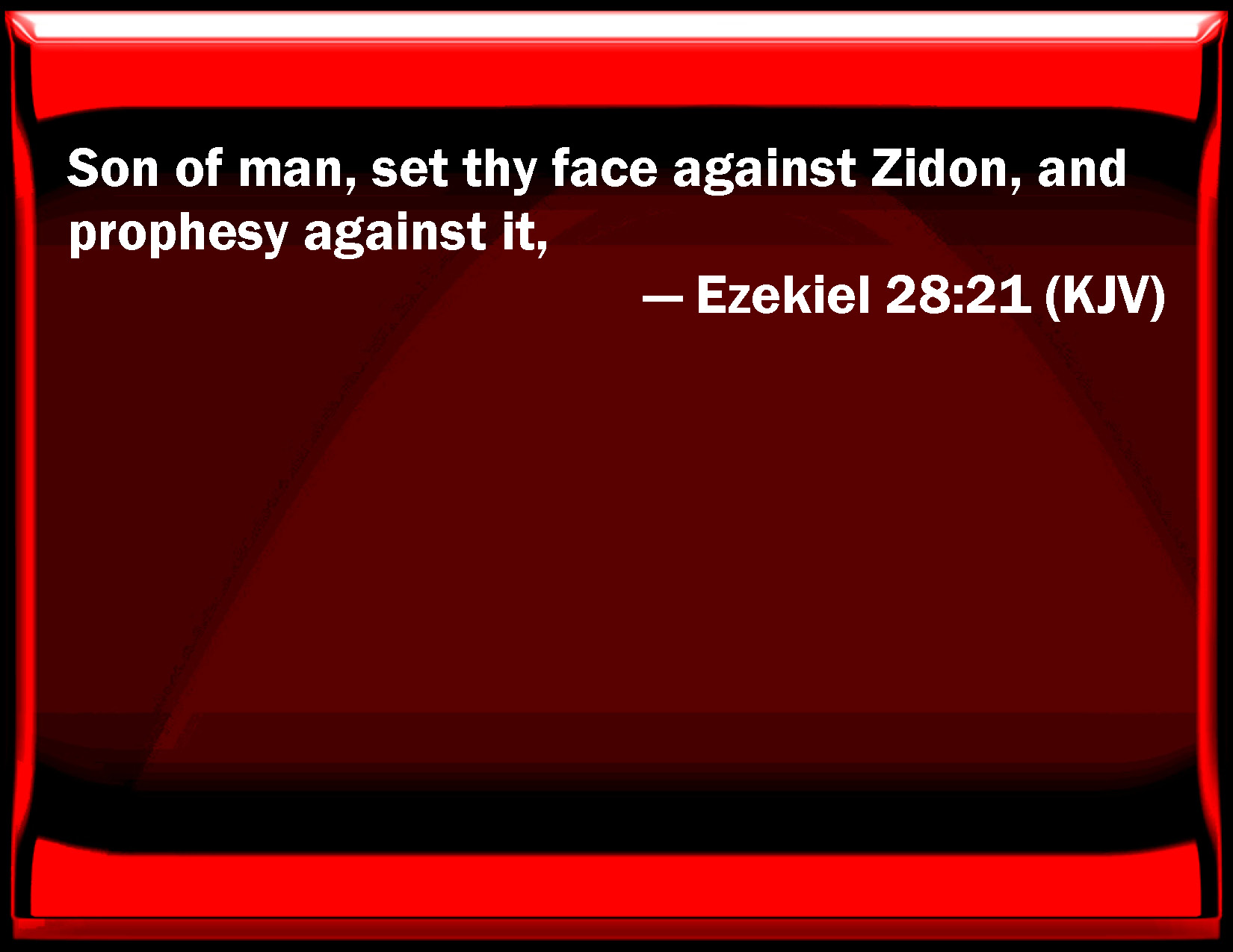 Bible Verse Slide Ezekiel 28:21 Son of man, set your face against Zidon, and prophesy against it, KJV: Son of man, set thy face against Zidon, and prophesy against it, DRB: Son of man, set thy face against Sidon: and thou shalt prophesy of it, DBT: Son of man, set thy face towards Zidon, and prophesy against it, ERV: Son of man, set thy face toward Zidon, and prophesy against it, WBT: Son of man, set thy face against Zidon, and prophesy against it, WEB: Son of man, set your face toward Sidon, and prophesy against it, YLT: 'Son of man, set thy face unto Zidon, and prophesy concerning it;Links Ezekiel 28:21 NIV • Ezekiel 28:21 NLT • Ezekiel 28:21 ESV • Ezekiel 28:21 NASB • Ezekiel 28:21 KJV • Ezekiel 28:21 Interlinear • Ezekiel 28:21 Commentaries • Ezekiel 28:21 Parallel Texts • Ezekiel 28:21 Bible Apps • Ezekiel 28:21 Parallel • Bible Hub |