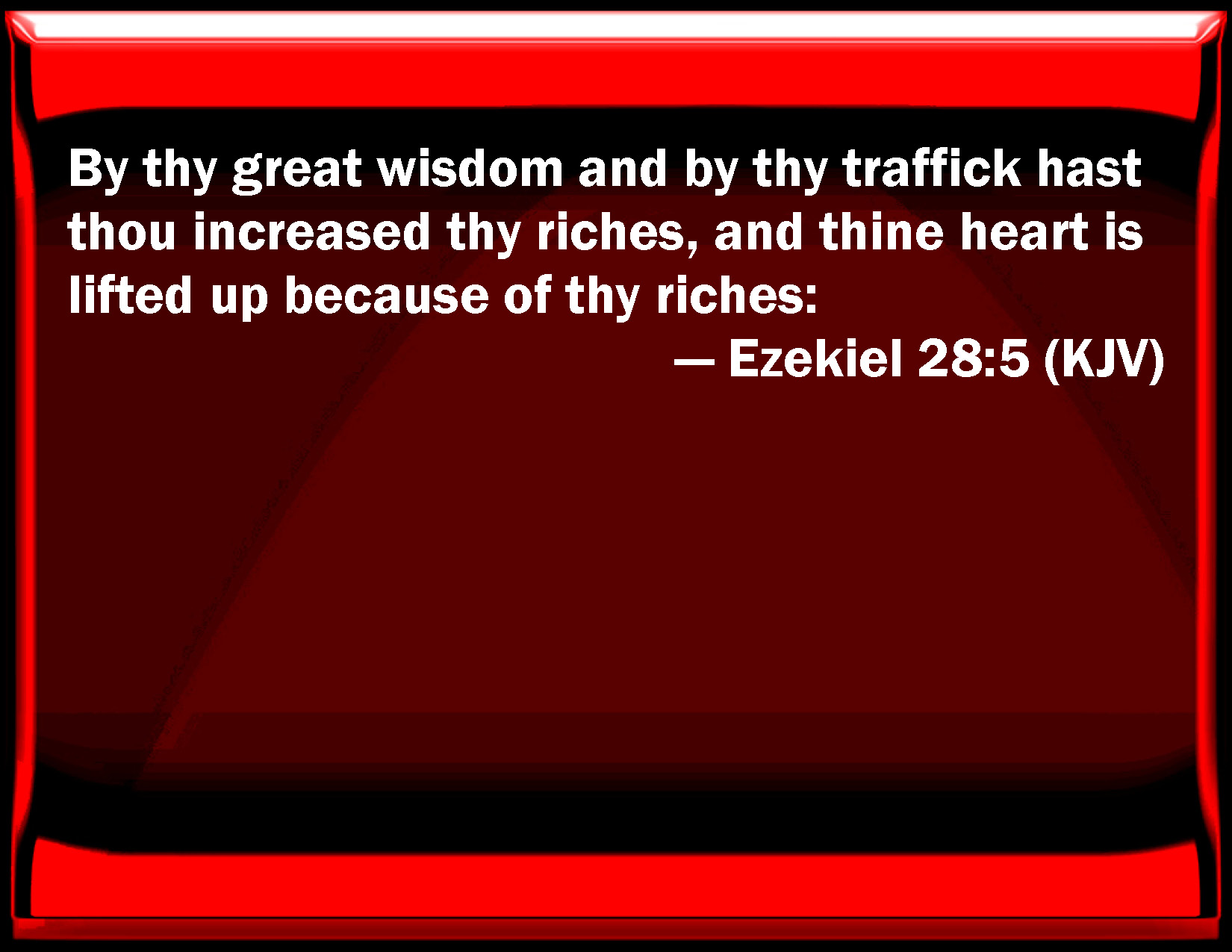 Bible Verse Slide Ezekiel 28:5 By your great wisdom and by your traffic have you increased your riches, and your heart is lifted up because of your riches: KJV: By thy great wisdom and by thy traffick hast thou increased thy riches, and thine heart is lifted up because of thy riches: DRB: By the greatness of thy wisdom, and by thy traffic thou hast increased thy strength: and thy heart is lifted up with thy strength. DBT: by thy great wisdom thou hast by thy traffic increased thy riches, and thy heart is lifted up because of thy riches. ERV: by thy great wisdom and by thy traffic hast thou increased thy riches, and thine heart is lifted up because of thy riches: WBT: By thy great wisdom and by thy traffick hast thou increased thy riches, and thy heart is lifted up because of thy riches: WEB: by your great wisdom [and] by your traffic you have increased your riches, and your heart is lifted up because of your riches— YLT: By the abundance of thy wisdom, Through thy merchandise, Thou hast multiplied thy wealth, And high is thy heart through thy wealth.Links Ezekiel 28:5 NIV • Ezekiel 28:5 NLT • Ezekiel 28:5 ESV • Ezekiel 28:5 NASB • Ezekiel 28:5 KJV • Ezekiel 28:5 Interlinear • Ezekiel 28:5 Commentaries • Ezekiel 28:5 Parallel Texts • Ezekiel 28:5 Bible Apps • Ezekiel 28:5 Parallel • Bible Hub |