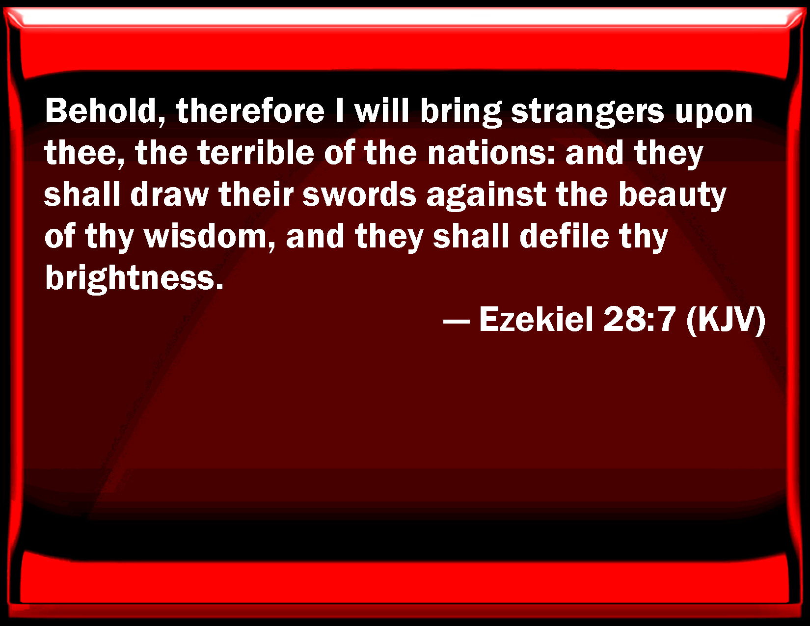 Bible Verse Slide Ezekiel 28:7 Behold, therefore I will bring strangers on you, the terrible of the nations: and they shall draw their swords against the beauty of your wisdom, and they shall defile your brightness. KJV: Behold, therefore I will bring strangers upon thee, the terrible of the nations: and they shall draw their swords against the beauty of thy wisdom, and they shall defile thy brightness. DRB: Therefore behold, I will bring upon thee strangers the strongest of the nations: and they shall draw their swords against the beauty of thy wisdom, and they shall defile thy beauty. DBT: therefore behold, I will bring strangers upon thee, the terrible of the nations; and they shall draw their swords against the beauty of thy wisdom, and they shall tarnish thy brightness. ERV: therefore behold, I will bring strangers upon thee, the terrible of the nations: and they shall draw their swords against the beauty of thy wisdom, and they shall defile thy brightness. WBT: Behold, therefore I will bring strangers upon thee, the terrible of the nations: and they shall draw their swords against the beauty of thy wisdom, and they shall defile thy brightness. WEB: therefore, behold, I will bring strangers on you, the terrible of the nations; and they shall draw their swords against the beauty of your wisdom, and they shall defile your brightness. YLT: Therefore, lo, I am bringing in against thee strangers, The terrible of the nations, And they have drawn out their swords Against the beauty of thy wisdom, And they have pierced thy brightness.Links Ezekiel 28:7 NIV • Ezekiel 28:7 NLT • Ezekiel 28:7 ESV • Ezekiel 28:7 NASB • Ezekiel 28:7 KJV • Ezekiel 28:7 Interlinear • Ezekiel 28:7 Commentaries • Ezekiel 28:7 Parallel Texts • Ezekiel 28:7 Bible Apps • Ezekiel 28:7 Parallel • Bible Hub |