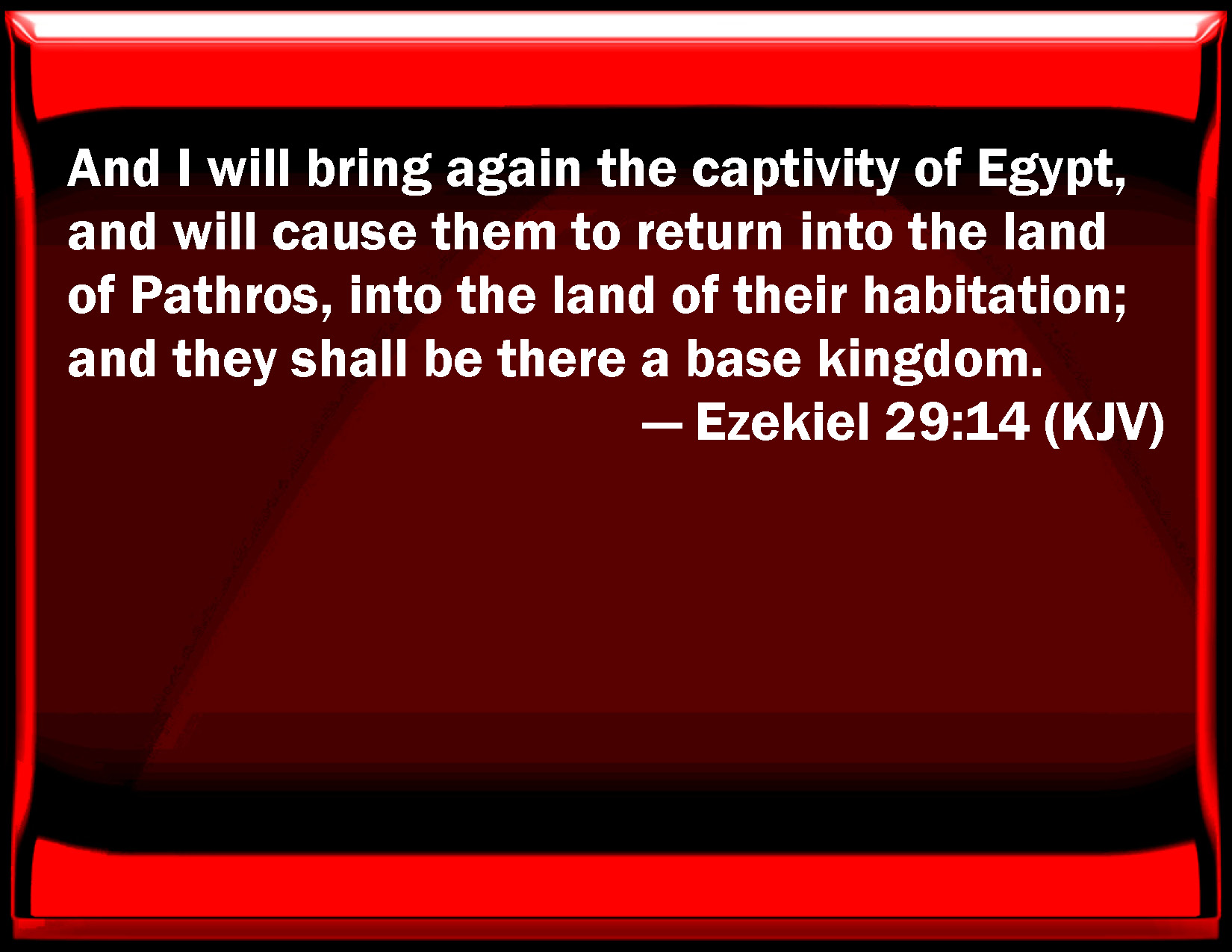 Bible Verse Slide Ezekiel 29:14 And I will bring again the captivity of Egypt, and will cause them to return into the land of Pathros, into the land of their habitation; and they shall be there a base kingdom. KJV: And I will bring again the captivity of Egypt, and will cause them to return into the land of Pathros, into the land of their habitation; and they shall be there a base kingdom. DRB: And I will bring hack the captivity of Egypt, and will place them in the land of Phatures, in the land of their nativity, and they shall be there a low kingdom: DBT: and I will turn again the captivity of Egypt, and will cause them to return to the land of Pathros, into the land of their birth, and they shall there be a base kingdom. ERV: and I will bring again the captivity of Egypt, and will cause them to return into the land of Pathros, into the land of their birth; and they shall be there a base kingdom. WBT: And I will bring again the captivity of Egypt, and will cause them to return into the land of Pathros, into the land of their habitation; and they shall be there a base kingdom. WEB: and I will bring back the captivity of Egypt, and will cause them to return into the land of Pathros, into the land of their birth; and they shall be there a base kingdom. YLT: And I have turned back to the captivity of Egypt, And I have brought them back To the land of Pathros, to the land of their birth, And they have been there a low kingdom.Links Ezekiel 29:14 NIV • Ezekiel 29:14 NLT • Ezekiel 29:14 ESV • Ezekiel 29:14 NASB • Ezekiel 29:14 KJV • Ezekiel 29:14 Interlinear • Ezekiel 29:14 Commentaries • Ezekiel 29:14 Parallel Texts • Ezekiel 29:14 Bible Apps • Ezekiel 29:14 Parallel • Bible Hub |