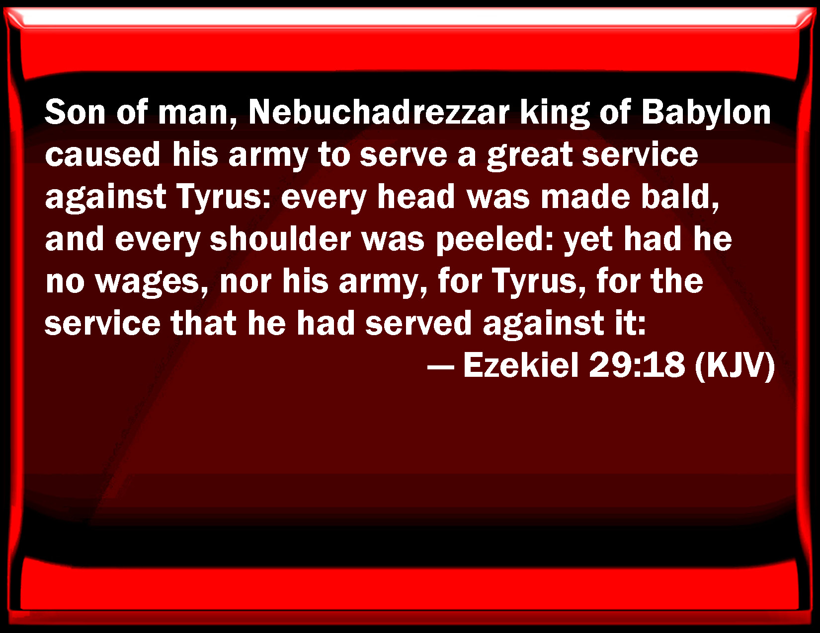 KJV:  Son of man, Nebuchadrezzar king of Babylon caused his army to serve a great service against Tyrus: every head was made bald, and every shoulder was peeled: yet had he no wages, nor his army, for Tyrus, for the service that he had served against it: