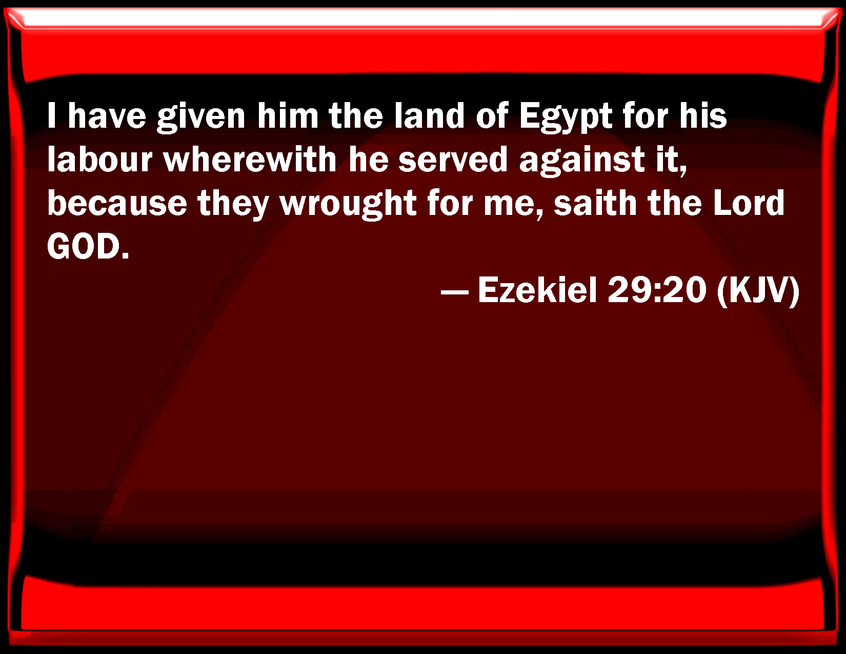 Bible Verse Slide Ezekiel 29:20 I have given him the land of Egypt for his labor with which he served against it, because they worked for me, said the Lord GOD. KJV: I have given him the land of Egypt for his labour wherewith he served against it, because they wrought for me, saith the Lord GOD. DRB: And for the service that he hath done me against it: I have given him the land of Egypt, because he hath laboured for me, saith the Lord God. DBT: I have given him the land of Egypt for his labour wherewith he served against it, because they wrought for me, saith the Lord Jehovah. ERV: I have given him the land of Egypt as his recompence for which he served, because they wrought for me, saith the Lord GOD. WBT: I have given him the land of Egypt for his labor with which he served against it, because they wrought for me, saith the Lord GOD. WEB: I have given him the land of Egypt as his recompense for which he served, because they worked for me, says the Lord Yahweh. YLT: His wage for which he laboured I have given to him, The land of Egypt — in that they wrought for Me, An affirmation of the Lord Jehovah.Links Ezekiel 29:20 NIV • Ezekiel 29:20 NLT • Ezekiel 29:20 ESV • Ezekiel 29:20 NASB • Ezekiel 29:20 KJV • Ezekiel 29:20 Interlinear • Ezekiel 29:20 Commentaries • Ezekiel 29:20 Parallel Texts • Ezekiel 29:20 Bible Apps • Ezekiel 29:20 Parallel • Bible Hub |