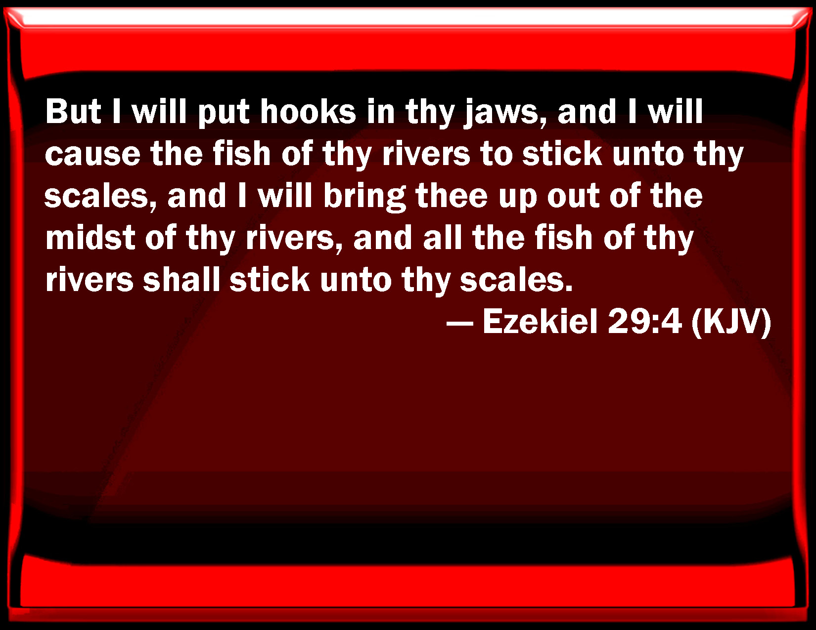 Bible Verse Slide Ezekiel 29:4 But I will put hooks in your jaws, and I will cause the fish of your rivers to stick to your scales, and I will bring you up out of the middle of your rivers, and all the fish of your rivers shall stick to your scales. KJV: But I will put hooks in thy jaws, and I will cause the fish of thy rivers to stick unto thy scales, and I will bring thee up out of the midst of thy rivers, and all the fish of thy rivers shall stick unto thy scales. DRB: But I will put a bridle in thy jaws: and I will cause the fish of thy rivers to stick to thy scales: and I will draw thee out of the midst of thy rivers, and all thy fish shall stick to thy scales. DBT: And I will put hooks in thy jaws, and I will cause the fish of thy rivers to stick unto thy scales, and I will bring thee up out of the midst of thy rivers, and all the fish of thy rivers shall stick unto thy scales; ERV: And I will put hooks in thy jaws, and I will cause the fish of thy rivers to stick unto thy scales; and I will bring thee up out of the midst of thy rivers, with all the fish of thy rivers which stick unto thy scales. WBT: But I will put hooks in thy jaws, and I will cause the fish of thy rivers to stick to thy scales, and I will bring thee out of the midst of thy rivers, and all the fish of thy rivers shall stick to thy scales. WEB: I will put hooks in your jaws, and I will make the fish of your rivers stick to your scales; and I will bring you up out of the midst of your rivers, with all the fish of your rivers which stick to your scales. YLT: And I have put hooks in thy jaws, And I have caused the fish of thy floods to cleave to thy scales, And I have caused thee to come up from the midst of thy floods, And every fish of thy floods to thy scales doth cleave.Links Ezekiel 29:4 NIV • Ezekiel 29:4 NLT • Ezekiel 29:4 ESV • Ezekiel 29:4 NASB • Ezekiel 29:4 KJV • Ezekiel 29:4 Interlinear • Ezekiel 29:4 Commentaries • Ezekiel 29:4 Parallel Texts • Ezekiel 29:4 Bible Apps • Ezekiel 29:4 Parallel • Bible Hub |