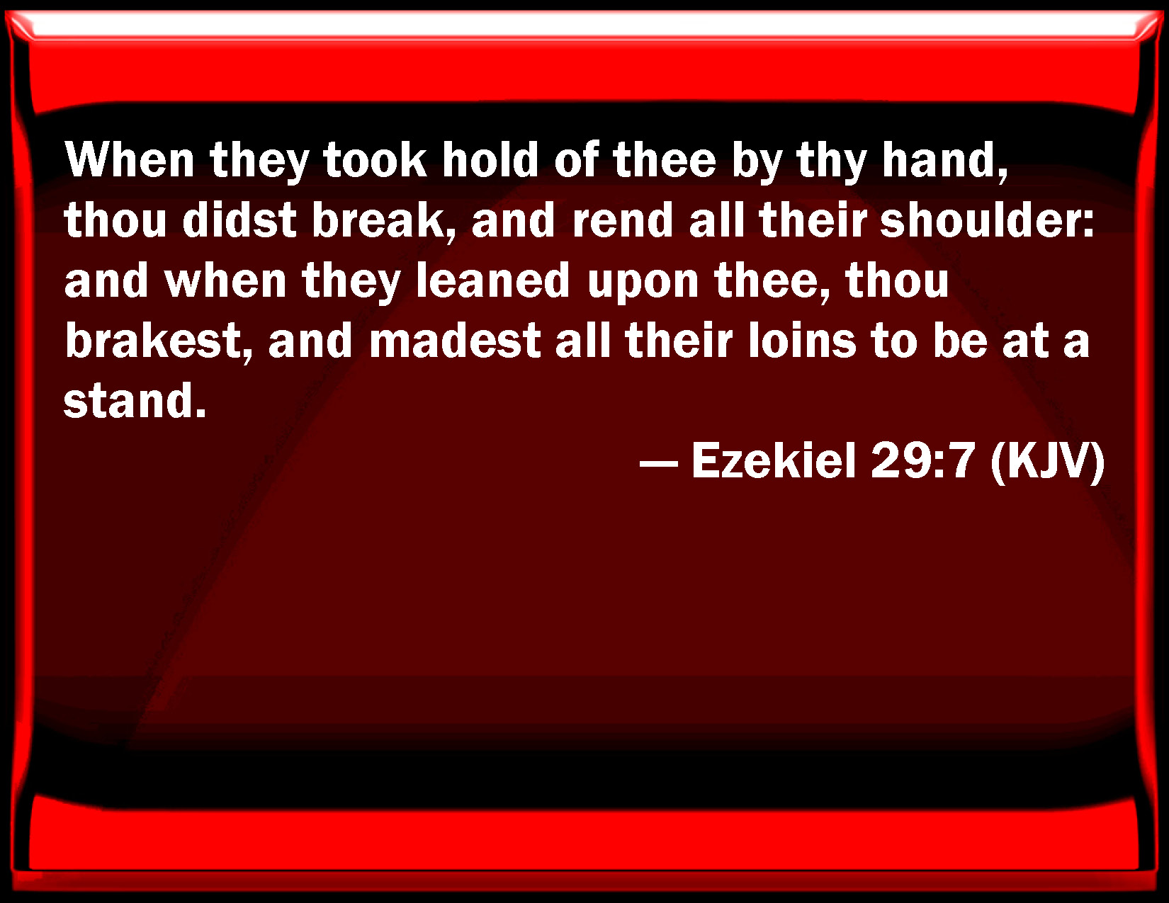 Bible Verse Slide Ezekiel 29:7 When they took hold of you by your hand, you did break, and rend all their shoulder: and when they leaned on you, you brake, and made all their loins to be at a stand. KJV: When they took hold of thee by thy hand, thou didst break, and rend all their shoulder: and when they leaned upon thee, thou brakest, and madest all their loins to be at a stand. DRB: When they took hold of thee with the hand thou didst break, and rent all their shoulder: and when they leaned upon thee, thou brokest, and weakenest all their loins. DBT: When they took hold of thee by thy hand, thou didst give way and rend all their shoulder; and when they leaned upon thee, thou didst break, and didst make all their loins to tremble. ERV: When they took hold of thee by thy hand, thou didst break, and didst rend all their shoulders: and when they leaned upon thee, thou brakest, and madest all their loins to be at a stand. WBT: When they took hold of thee by thy hand, thou didst break, and rend all their shoulder: and when they leaned upon thee, thou didst break, and make all their loins to be at a stand. WEB: When they took hold of you by your hand, you broke, and tore all their shoulders; and when they leaned on you, you broke, and paralyzed all of their thighs." YLT: In their taking hold of thee by thy hand, — thou art crushed, And hast rent to them all the shoulder, And in their leaning on thee thou art broken, And hast caused all their thighs to stand.Links Ezekiel 29:7 NIV • Ezekiel 29:7 NLT • Ezekiel 29:7 ESV • Ezekiel 29:7 NASB • Ezekiel 29:7 KJV • Ezekiel 29:7 Interlinear • Ezekiel 29:7 Commentaries • Ezekiel 29:7 Parallel Texts • Ezekiel 29:7 Bible Apps • Ezekiel 29:7 Parallel • Bible Hub |