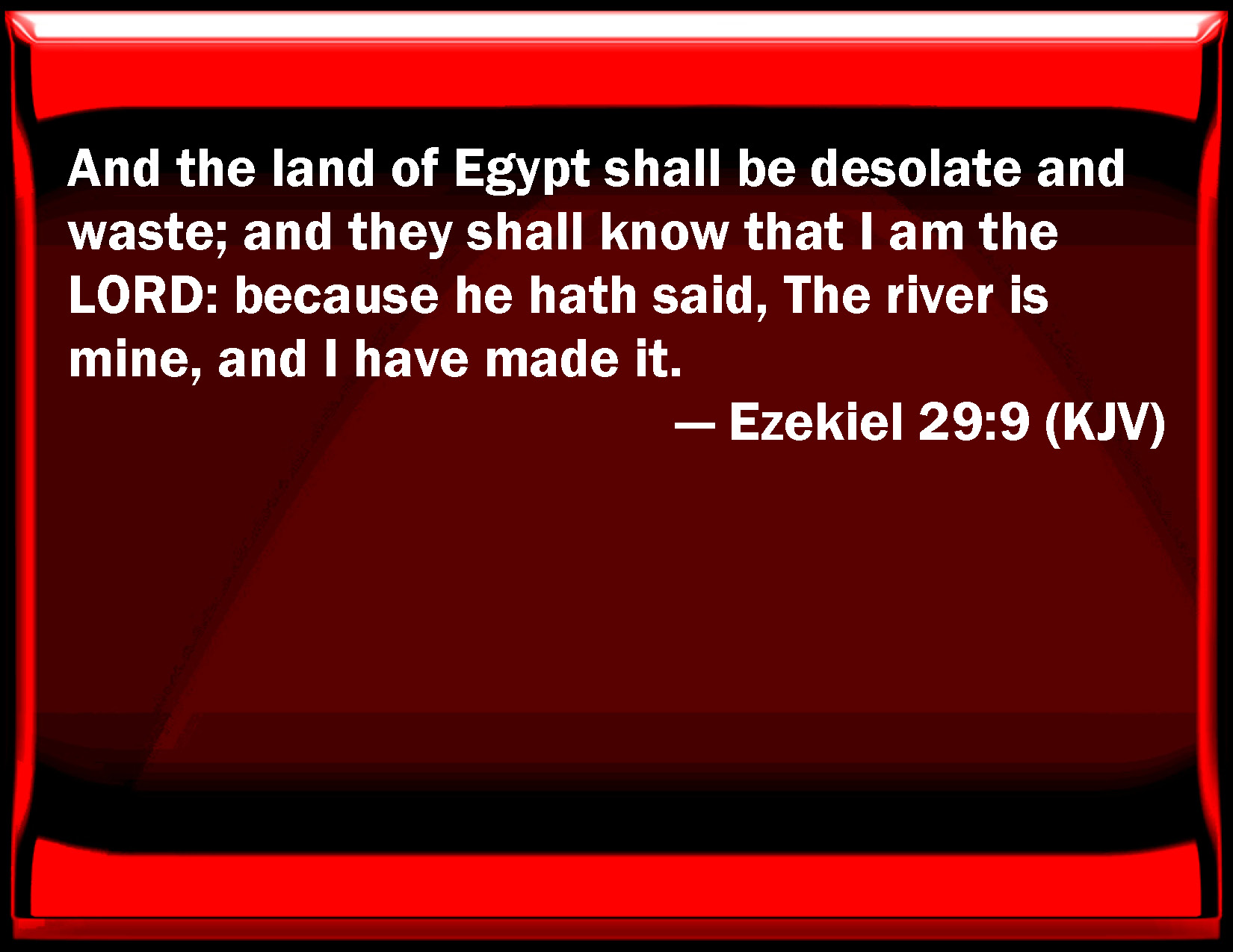 Bible Verse Slide Ezekiel 29:9 And the land of Egypt shall be desolate and waste; and they shall know that I am the LORD: because he has said, The river is mine, and I have made it. KJV: And the land of Egypt shall be desolate and waste; and they shall know that I am the LORD: because he hath said, The river is mine, and I have made it. DRB: And the land of Egypt shall become a desert, and a wilderness: and they shall know that I am the Lord: because thou hast said: The river is mine, and I made DBT: And the land of Egypt shall be a desolation and a waste: and they shall know that I am Jehovah, because he saith, The river is mine, and I made it. ERV: And the land of Egypt shall be a desolation and a waste; and they shall know that I am the LORD: because he hath said, The river is mine, and I have made it. WBT: And the land of Egypt shall be desolate and waste; and they shall know that I am the LORD: because he hath said, The river is mine, and I have made it. WEB: The land of Egypt shall be a desolation and a waste; and they shall know that I am Yahweh. Because he has said, 'The river is mine, and I have made it;' YLT: And the land of Egypt hath been for a desolation and a waste, And they have known that I am Jehovah. Because he said: The flood is mine, and I made it.Links Ezekiel 29:9 NIV • Ezekiel 29:9 NLT • Ezekiel 29:9 ESV • Ezekiel 29:9 NASB • Ezekiel 29:9 KJV • Ezekiel 29:9 Interlinear • Ezekiel 29:9 Commentaries • Ezekiel 29:9 Parallel Texts • Ezekiel 29:9 Bible Apps • Ezekiel 29:9 Parallel • Bible Hub |