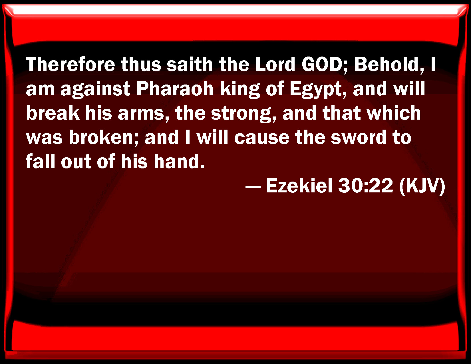 Bible Verse Slide Ezekiel 30:22 Therefore thus said the Lord GOD; Behold, I am against Pharaoh king of Egypt, and will break his arms, the strong, and that which was broken; and I will cause the sword to fall out of his hand. KJV: Therefore thus saith the Lord GOD; Behold, I am against Pharaoh king of Egypt, and will break his arms, the strong, and that which was broken; and I will cause the sword to fall out of his hand. DRB: Therefore, thus saith the Lord God: Behold, I come against Pharao king of Egypt, and I will break into pieces his strong arm, which is already broken: and I will cause the sword to fall out of his hand: DBT: Therefore thus saith the Lord Jehovah: Behold, I am against Pharaoh king of Egypt, and will break his arms, the strong one, and that which was broken; and I will cause the sword to fall out of his hand. ERV: Therefore thus saith the Lord GOD: Behold, I am against Pharaoh king of Egypt, and will break his arms, the strong, and that which was broken; and I will cause the sword to fall out of his hand. WBT: Therefore thus saith the Lord GOD; Behold, I am against Pharaoh king of Egypt, and will break his arms, the strong, and that which was broken; and I will cause the sword to fall out of his hand. WEB: Therefore thus says the Lord Yahweh: Behold, I am against Pharaoh king of Egypt, and will break his arms, the strong [arm], and that which was broken; and I will cause the sword to fall out of his hand. YLT: Therefore, thus said the Lord Jehovah: Lo, I am against Pharaoh, king of Egypt, And I have broken his arms, The strong one and the broken one, And have caused the sword to fall out of his hand,Links Ezekiel 30:22 NIV • Ezekiel 30:22 NLT • Ezekiel 30:22 ESV • Ezekiel 30:22 NASB • Ezekiel 30:22 KJV • Ezekiel 30:22 Interlinear • Ezekiel 30:22 Commentaries • Ezekiel 30:22 Parallel Texts • Ezekiel 30:22 Bible Apps • Ezekiel 30:22 Parallel • Bible Hub |