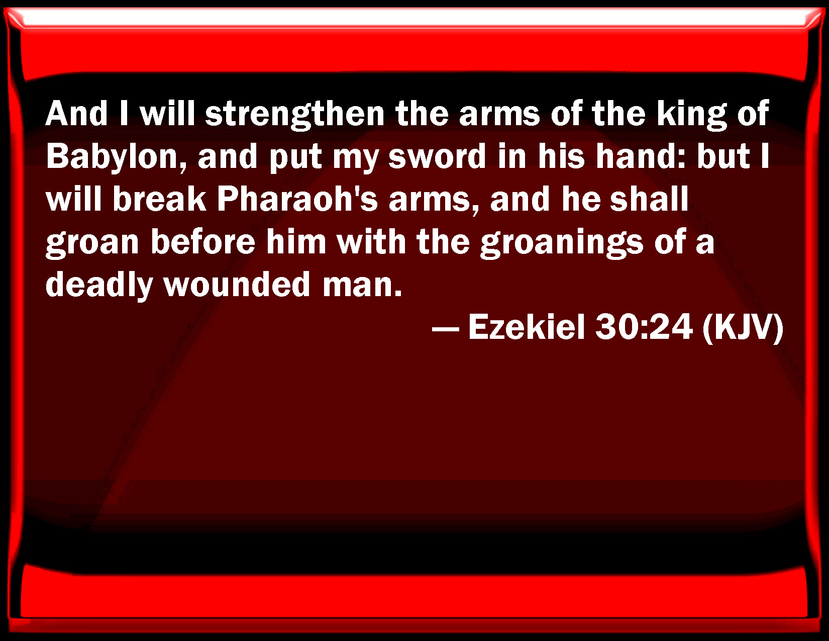 Bible Verse Slide Ezekiel 30:24 And I will strengthen the arms of the king of Babylon, and put my sword in his hand: but I will break Pharaoh's arms, and he shall groan before him with the groanings of a deadly wounded man. KJV: And I will strengthen the arms of the king of Babylon, and put my sword in his hand: but I will break Pharaoh's arms, and he shall groan before him with the groanings of a deadly wounded man. DRB: And I will strengthen the arms of the king of Babylon, and will put my sword in his hand: and I will break the arms of Pharao, and they shall groan bitterly being slain before his face. DBT: And I will strengthen the arms of the king of Babylon, and put my sword in his hand; and I will break Pharaoh's arms, so that he shall groan before him with the groanings of a deadly-wounded man. ERV: And I will strengthen the arms of the king of Babylon, and put my sword in his hand: but I will break the arms of Pharaoh, and he shall groan before him with the groanings of a deadly wounded man. WBT: And I will strengthen the arms of the king of Babylon, and put my sword in his hand: but I will break Pharaoh's arms, and he shall groan before him with the groanings of a deadly wounded man. WEB: I will strengthen the arms of the king of Babylon, and put my sword in his hand: but I will break the arms of Pharaoh, and he shall groan before him with the groanings of a deadly wounded man. YLT: And strengthened the arms of the king of Babylon, And I have given My sword into his hand, And I have broken the arms of Pharaoh, And he hath groaned the groans of a pierced one — before him.Links Ezekiel 30:24 NIV • Ezekiel 30:24 NLT • Ezekiel 30:24 ESV • Ezekiel 30:24 NASB • Ezekiel 30:24 KJV • Ezekiel 30:24 Interlinear • Ezekiel 30:24 Commentaries • Ezekiel 30:24 Parallel Texts • Ezekiel 30:24 Bible Apps • Ezekiel 30:24 Parallel • Bible Hub |