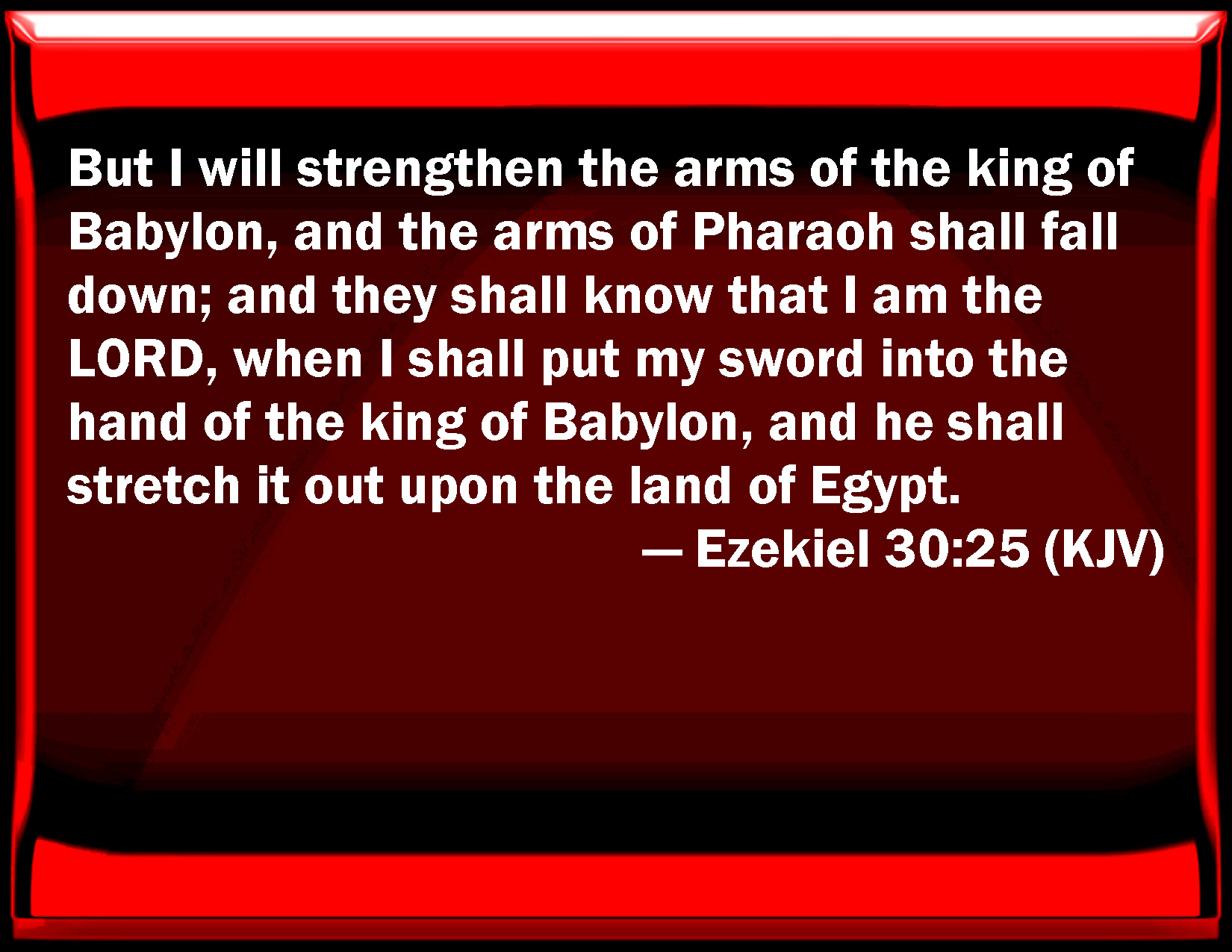 Bible Verse Slide Ezekiel 30:25 But I will strengthen the arms of the king of Babylon, and the arms of Pharaoh shall fall down; and they shall know that I am the LORD, when I shall put my sword into the hand of the king of Babylon, and he shall stretch it out on the land of Egypt. KJV: But I will strengthen the arms of the king of Babylon, and the arms of Pharaoh shall fall down; and they shall know that I am the LORD, when I shall put my sword into the hand of the king of Babylon, and he shall stretch it out upon the land of Egypt. DRB: And I will strengthen the arms of the king of Babylon, and the arms of Pharao shall fall: and they shall know that I am the Lord, when I shall have given my sword into the hand of the king of Babylon, and he shall have stretched it forth upon the land of Egypt. DBT: And I will strengthen the arms of the king of Babylon, and the arms of Pharaoh shall fall down; and they shall know that I am Jehovah, when I have put my sword into the hand of the king of Babylon, and he shall have stretched it out upon the land of Egypt. ERV: And I will hold up the arms of the king of Babylon, and the arms of Pharaoh shall fall down; and they shall know that I am the LORD, when I shall put my sword into the hand of the king of Babylon, and he shall stretch it out upon the land of Egypt. WBT: But I will strengthen the arms of the king of Babylon, and the arms of Pharaoh shall fall down; and they shall know that I am the LORD, when I shall put my sword into the hand of the king of Babylon, and he shall stretch it out upon the land of Egypt. WEB: I will hold up the arms of the king of Babylon; and the arms of Pharaoh shall fall down; and they shall know that I am Yahweh, when I shall put my sword into the hand of the king of Babylon, and he shall stretch it out on the land of Egypt. YLT: And I have strengthened the arms of the king of Babylon, And the arms of Pharaoh do fall down, And they have known that I am Jehovah, In My giving My sword into the hand of the king of Babylon, And he hath stretched it out toward the land of Egypt.Links Ezekiel 30:25 NIV • Ezekiel 30:25 NLT • Ezekiel 30:25 ESV • Ezekiel 30:25 NASB • Ezekiel 30:25 KJV • Ezekiel 30:25 Interlinear • Ezekiel 30:25 Commentaries • Ezekiel 30:25 Parallel Texts • Ezekiel 30:25 Bible Apps • Ezekiel 30:25 Parallel • Bible Hub |
