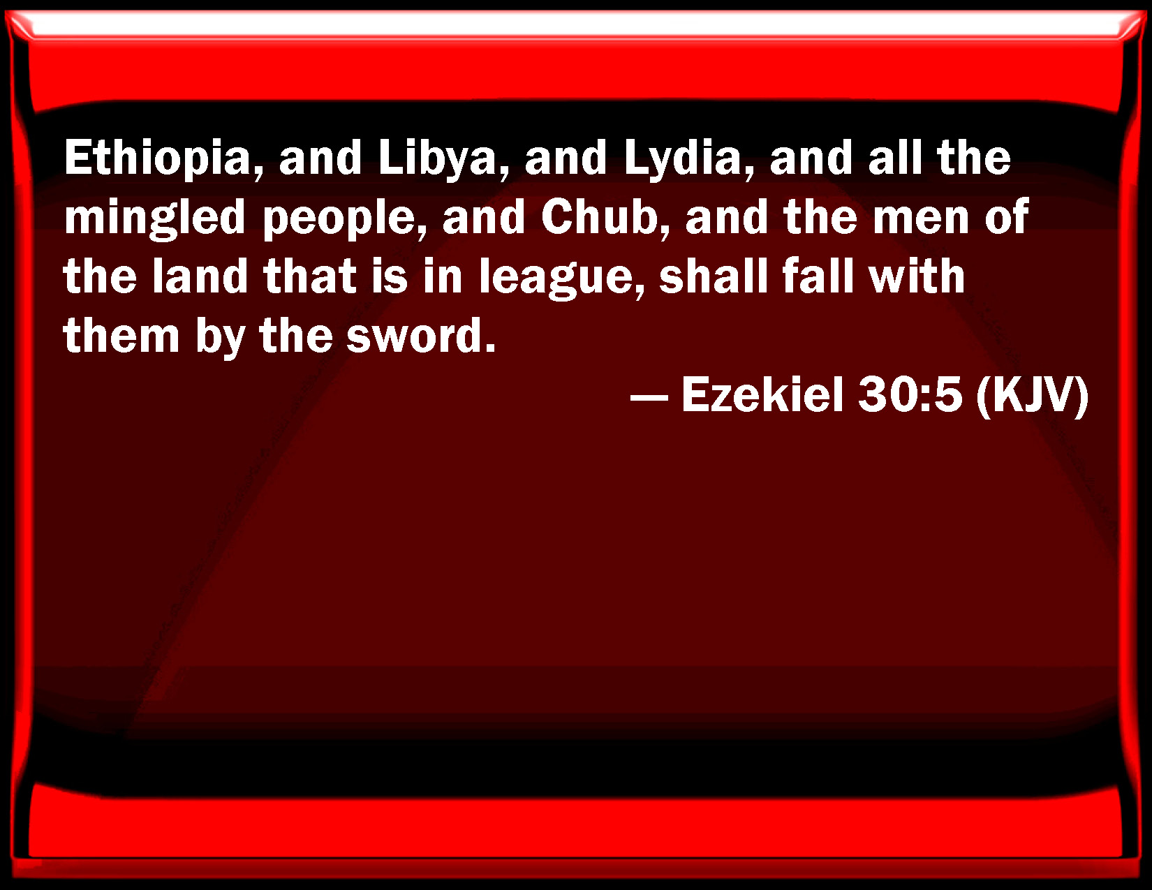 Bible Verse Slide Ezekiel 30:5 Ethiopia, and Libya, and Lydia, and all the mingled people, and Chub, and the men of the land that is in league, shall fall with them by the sword. KJV: Ethiopia, and Libya, and Lydia, and all the mingled people, and Chub, and the men of the land that is in league, shall fall with them by the sword. DRB: Ethiopia, and Libya, and Lydia, and all the rest of the crowd, and Chub, and the children of the land of the covenant, shall fall with them by the sword. DBT: Cush, and Phut, and Lud, and all the mingled people, and Chub, and the children of the land that is in league, shall fall with them by the sword. ERV: Ethiopia, and Put, and Lud, and all the mingled people, and Cub, and the children of the land that is in league, shall fall with them by the sword. WBT: Cush, and Libya, and Lydia, and all the mingled people, and Kub, and the men of the land that is in league, shall fall with them by the sword. WEB: Ethiopia, and Put, and Lud, and all the mixed people, and Cub, and the children of the land that is allied with them, shall fall with them by the sword. YLT: Cush, and Phut, and Lud, and all the mixture, and Chub, And the sons of the land of the covenant with them by sword do fall,Links Ezekiel 30:5 NIV • Ezekiel 30:5 NLT • Ezekiel 30:5 ESV • Ezekiel 30:5 NASB • Ezekiel 30:5 KJV • Ezekiel 30:5 Interlinear • Ezekiel 30:5 Commentaries • Ezekiel 30:5 Parallel Texts • Ezekiel 30:5 Bible Apps • Ezekiel 30:5 Parallel • Bible Hub |
