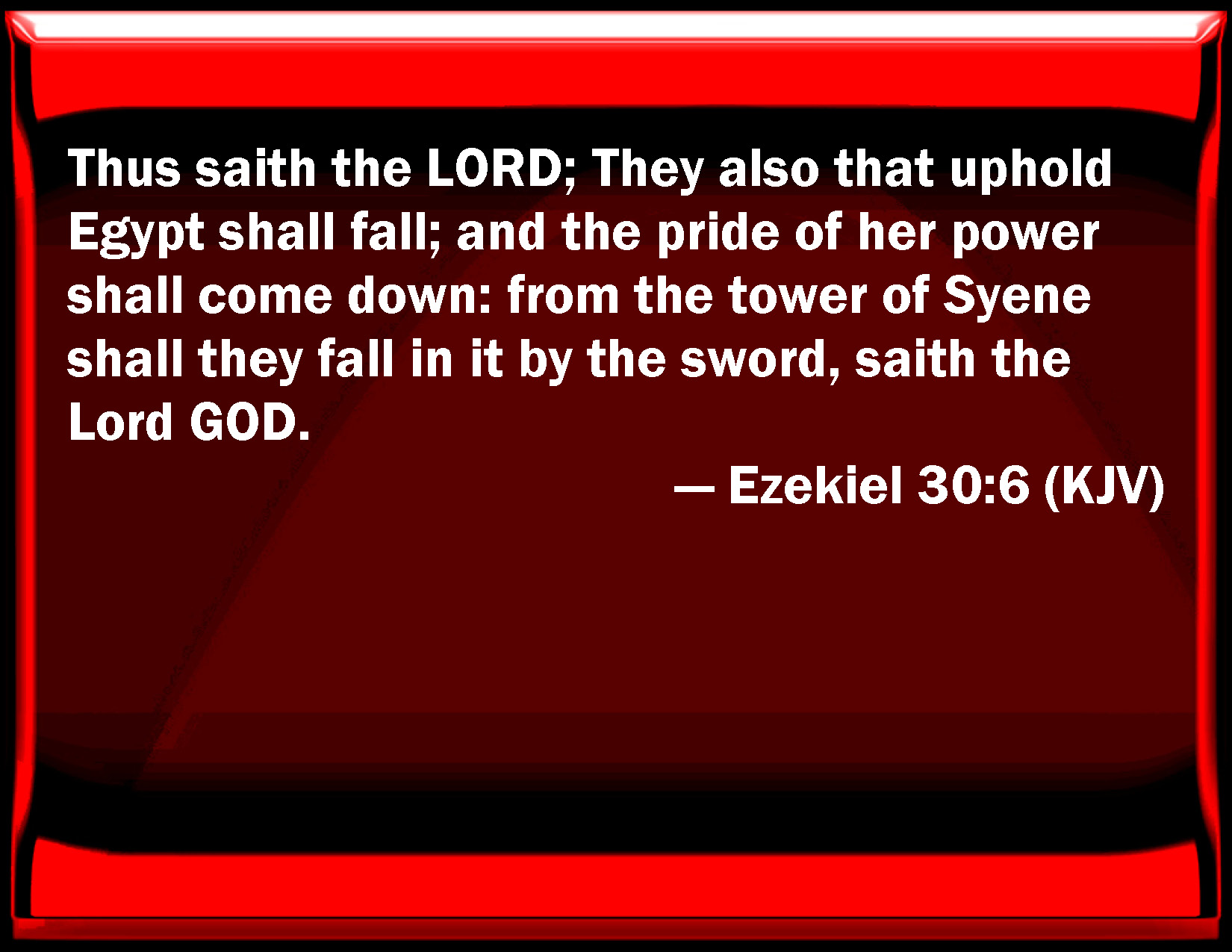 Bible Verse Slide Ezekiel 30:6 Thus said the LORD; They also that uphold Egypt shall fall; and the pride of her power shall come down: from the tower of Syene shall they fall in it by the sword, said the Lord GOD. KJV: Thus saith the LORD; They also that uphold Egypt shall fall; and the pride of her power shall come down: from the tower of Syene shall they fall in it by the sword, saith the Lord GOD. DRB: Thus saith the Lord God: They also that uphold Egypt shall fall, and the pride of her empire shall be brought down: from the tower of Syene shall they fall in it by the sword, saith the Lord the God of hosts. DBT: Thus saith Jehovah: They also that uphold Egypt shall fall; and the pride of her strength shall come down: from Migdol to Syene shall they fall in her by the sword, saith the Lord Jehovah. ERV: Thus saith the LORD: They also that uphold Egypt shall fall, and the pride of her power shall come down: from the tower of Seveneh shall they fall in it by the sword, saith the Lord GOD. WBT: Thus saith the LORD; They also that uphold Egypt shall fall; and the pride of her power shall come down: from the tower of Syene shall they fall in it by the sword, saith the Lord GOD. WEB: Thus says Yahweh: They also who uphold Egypt shall fall; and the pride of her power shall come down: from the tower of Seveneh shall they fall in it by the sword, says the Lord Yahweh. YLT: Thus said Jehovah: And — fallen have supporters of Egypt, And come down hath the arrogance of her strength, From Migdol to Syene, by sword they fall in her, An affirmation of the Lord Jehovah.Links Ezekiel 30:6 NIV • Ezekiel 30:6 NLT • Ezekiel 30:6 ESV • Ezekiel 30:6 NASB • Ezekiel 30:6 KJV • Ezekiel 30:6 Interlinear • Ezekiel 30:6 Commentaries • Ezekiel 30:6 Parallel Texts • Ezekiel 30:6 Bible Apps • Ezekiel 30:6 Parallel • Bible Hub |
