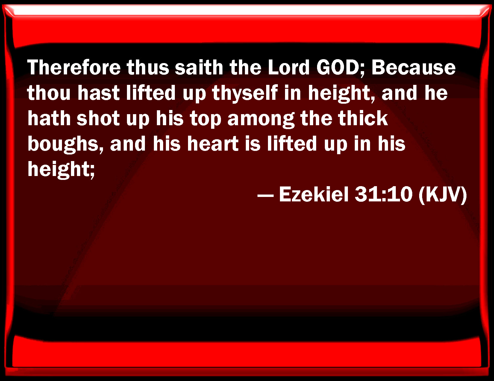Bible Verse Slide Ezekiel 31:10 Therefore thus said the Lord GOD; Because you have lifted up yourself in height, and he has shot up his top among the thick boughs, and his heart is lifted up in his height; KJV: Therefore thus saith the Lord GOD; Because thou hast lifted up thyself in height, and he hath shot up his top among the thick boughs, and his heart is lifted up in his height; DRB: Therefore thus saith the Lord God Because he was exalted in height, and shot up his top green and thick, and his heart was lifted up in his height: DBT: Therefore thus saith the Lord Jehovah: Because thou hast lifted up thyself in stature, ... and he hath set his top amidst the thick boughs, and his heart is lifted up in his height, ERV: Therefore thus said the Lord GOD: Because thou art exalted in stature, and he hath set his top among the thick boughs, and his heart is lifted up in his height; WBT: Therefore thus saith the Lord GOD; Because thou hast lifted up thyself in hight, and he hath shot up his top among the thick boughs, and his heart is lifted up in his hight; WEB: Therefore thus said the Lord Yahweh: Because you are exalted in stature, and he has set his top among the thick boughs, and his heart is lifted up in his height; YLT: Therefore, thus said the Lord Jehovah: Because that thou hast been high in stature, And he yieldeth his foliage between thickets, And high is his heart in his haughtiness,Links Ezekiel 31:10 NIV • Ezekiel 31:10 NLT • Ezekiel 31:10 ESV • Ezekiel 31:10 NASB • Ezekiel 31:10 KJV • Ezekiel 31:10 Interlinear • Ezekiel 31:10 Commentaries • Ezekiel 31:10 Parallel Texts • Ezekiel 31:10 Bible Apps • Ezekiel 31:10 Parallel • Bible Hub |