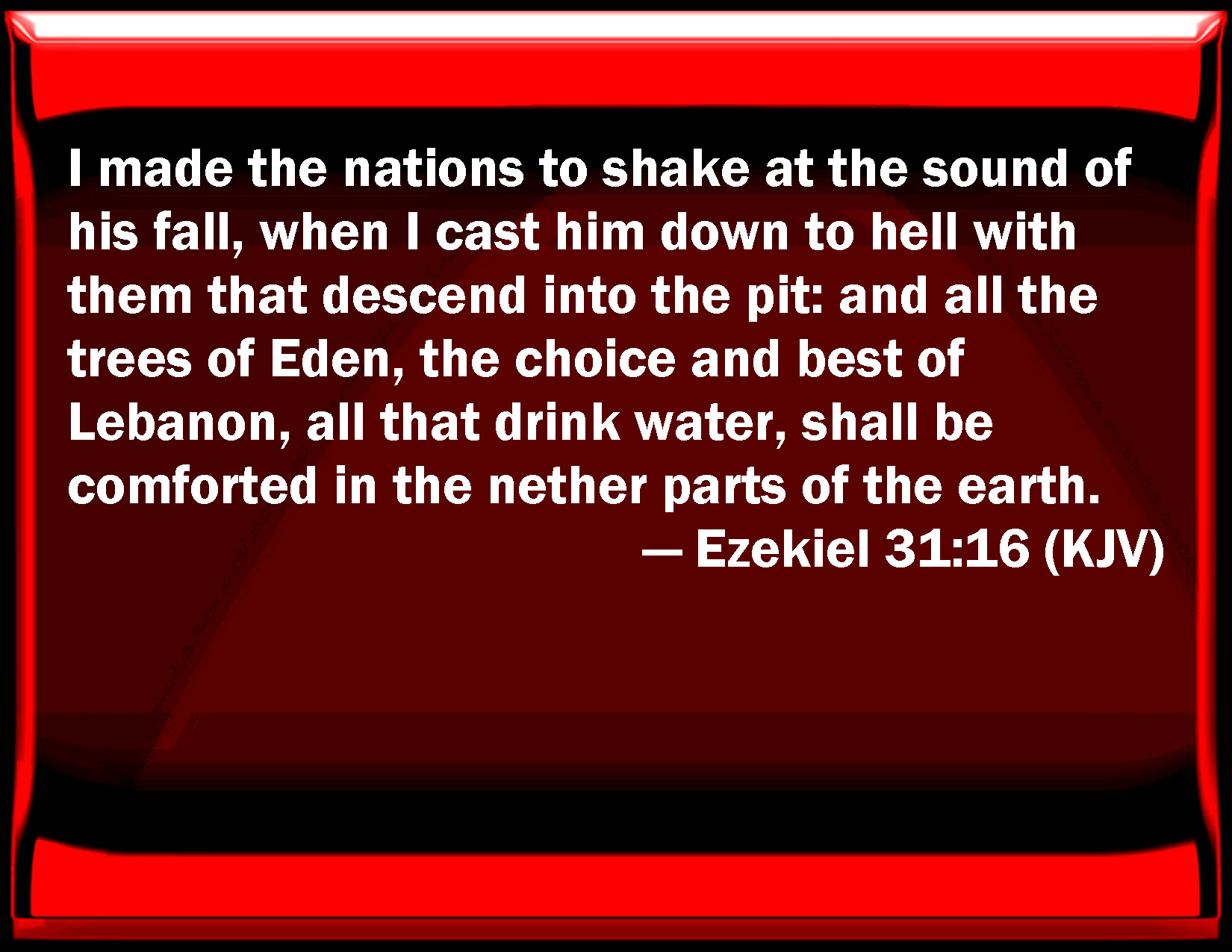 Bible Verse Slide Ezekiel 31:16 I made the nations to shake at the sound of his fall, when I cast him down to hell with them that descend into the pit: and all the trees of Eden, the choice and best of Lebanon, all that drink water, shall be comforted in the nether parts of the earth. KJV: I made the nations to shake at the sound of his fall, when I cast him down to hell with them that descend into the pit: and all the trees of Eden, the choice and best of Lebanon, all that drink water, shall be comforted in the nether parts of the earth. DRB: I shook the nations with the sound of his fall, when I brought him down to hell with them that descend into the pit: and all the trees of pleasure, the choice and best in Libanus, all that were moistened with waters, were comforted in the lowest parts of the earth. DBT: I made the nations to shake at the sound of his fall, when I cast him down to Sheol, with them that go down into the pit; and all the trees of Eden, the choice and best of Lebanon, all that drink water, were comforted in the lower parts of the earth. ERV: I made the nations to shake at the sound of his fall, when I cast him down to hell with them that descend into the pit: and all the trees of Eden, the choice and best of Lebanon, all that drink water, were comforted in the nether parts of the earth. WBT: I made the nations to shake at the sound of his fall, when I cast him down to the grave with them that descend into the pit: and all the trees of Eden, the choice and best of Lebanon, all that drink water, shall be comforted in the nether parts of the earth. WEB: I made the nations to shake at the sound of his fall, when I cast him down to Sheol with those who descend into the pit; and all the trees of Eden, the choice and best of Lebanon, all that drink water, were comforted in the lower parts of the earth. YLT: From the sound of his fall I have caused nations to shake, In My causing him to go down to sheol, With those going down to the pit, And comforted in the earth — the lower part, are all trees of Eden, The choice and the good of Lebanon, All drinking waters.Links Ezekiel 31:16 NIV • Ezekiel 31:16 NLT • Ezekiel 31:16 ESV • Ezekiel 31:16 NASB • Ezekiel 31:16 KJV • Ezekiel 31:16 Interlinear • Ezekiel 31:16 Commentaries • Ezekiel 31:16 Parallel Texts • Ezekiel 31:16 Bible Apps • Ezekiel 31:16 Parallel • Bible Hub |