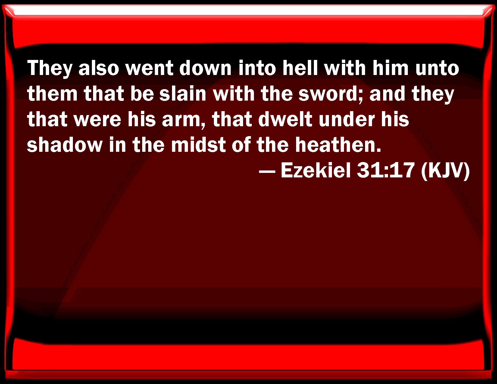 Bible Verse Slide Ezekiel 31:17 They also went down into hell with him to them that be slain with the sword; and they that were his arm, that dwelled under his shadow in the middle of the heathen. KJV: They also went down into hell with him unto them that be slain with the sword; and they that were his arm, that dwelt under his shadow in the midst of the heathen. DRB: For they also shall go down with him to hell to them that are slain by the sword: and the arm of every one shall sit down under his shadow in the midst of the nations. DBT: They also went down into Sheol with him unto them that were slain with the sword, and that were his arm, that dwelt under his shadow in the midst of the nations. ERV: They also went down into hell with him unto them that be slain by the sword; yea, they that were his arm, that dwelt under his shadow in the midst of the nations. WBT: They also went down into the grave with him to them that are slain with the sword; and they that were his arm, that dwelt under his shade in the midst of the heathen. WEB: They also went down into Sheol with him to those who are slain by the sword; yes, those who were his arm, [that] lived under his shadow in the midst of the nations. YLT: Also they with him have gone down to sheol, Unto the pierced of the sword, And — his arm — they dwelt in his shade in the midst of nations.Links Ezekiel 31:17 NIV • Ezekiel 31:17 NLT • Ezekiel 31:17 ESV • Ezekiel 31:17 NASB • Ezekiel 31:17 KJV • Ezekiel 31:17 Interlinear • Ezekiel 31:17 Commentaries • Ezekiel 31:17 Parallel Texts • Ezekiel 31:17 Bible Apps • Ezekiel 31:17 Parallel • Bible Hub |