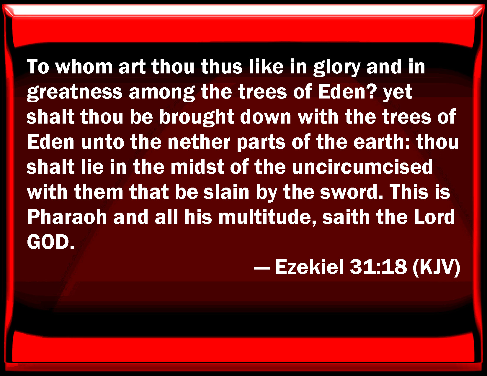 To whom art thou thus like in glory and in greatness among the trees of Eden? Yet shalt thou be brought down with the trees of Eden, unto the lower parts of the earth; thou shalt lie in the midst of the uncircumcised, with them that are slain by the sword. This is Pharaoh and all his multitude, saith the Lord Jehovah.