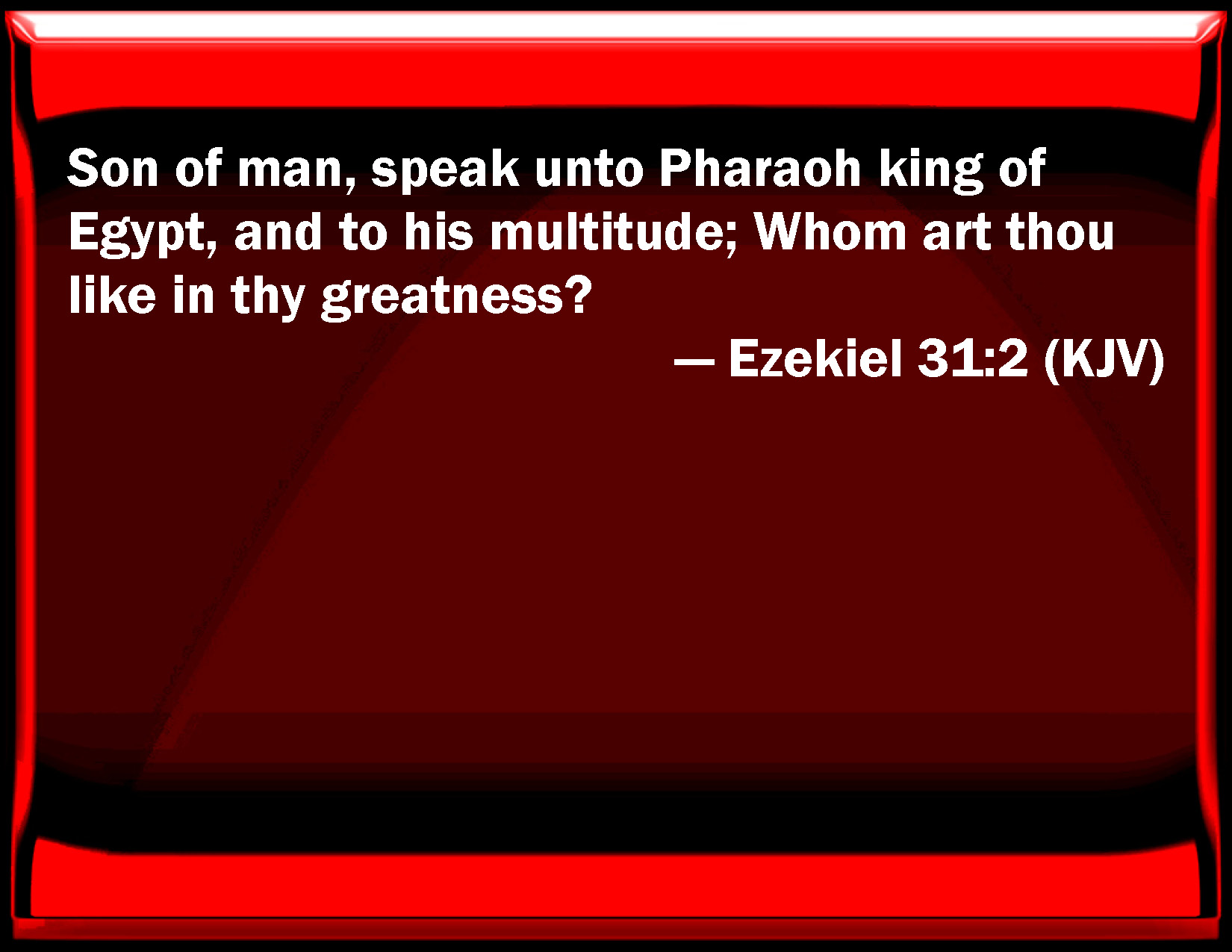 Bible Verse Slide Ezekiel 31:2 Son of man, speak to Pharaoh king of Egypt, and to his multitude; Whom are you like in your greatness? KJV: Son of man, speak unto Pharaoh king of Egypt, and to his multitude; Whom art thou like in thy greatness? DRB: Son of man, speak to Pharao king of Egypt, and to his people: To whom art thou like in thy greatness? DBT: Son of man, say unto Pharaoh king of Egypt, and to his multitude: Whom art thou like in thy greatness? ERV: Son of man, say unto Pharaoh king of Egypt, and to his multitude; Whom art thou like in thy greatness? WBT: Son of man, speak to Pharaoh king of Egypt, and to his multitude; Whom art thou like in thy greatness? WEB: Son of man, tell Pharaoh king of Egypt, and to his multitude: Whom are you like in your greatness? YLT: 'Son of man, say unto Pharaoh king of Egypt, and unto his multitude: To whom hast thou been like in thy greatness?Links Ezekiel 31:2 NIV • Ezekiel 31:2 NLT • Ezekiel 31:2 ESV • Ezekiel 31:2 NASB • Ezekiel 31:2 KJV • Ezekiel 31:2 Interlinear • Ezekiel 31:2 Commentaries • Ezekiel 31:2 Parallel Texts • Ezekiel 31:2 Bible Apps • Ezekiel 31:2 Parallel • Bible Hub |